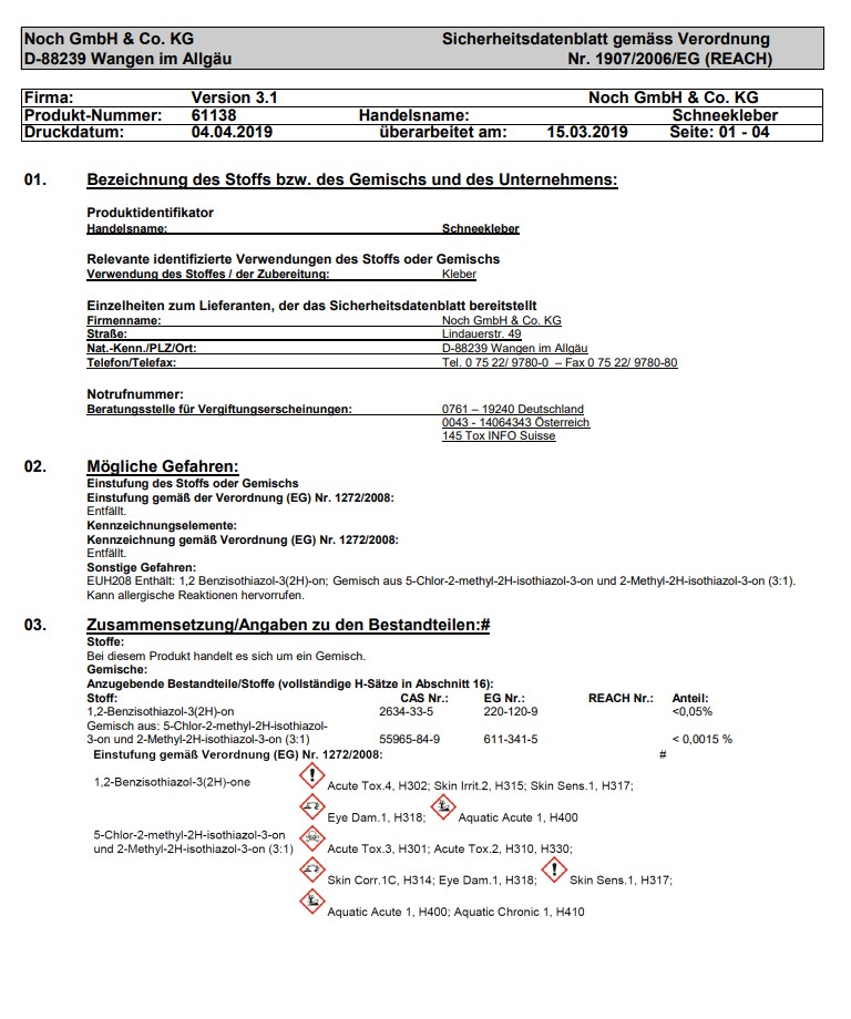 Schnee-Kleber enthält: 1,2 Benzisothiazol-3(2H)-on; Gemisch aus 5-Chlor-2-methyl-2H-isothiazol-3-on und 2-Methyl-2H-isothiazol-3-on (3:1). Kann allergische Reaktionen hervorrufen. Hinweis: Modellbauartikel. Kein Spielzeug! Ein Sicherheitsdatenblatt finden Sie in der Bilderreihe.