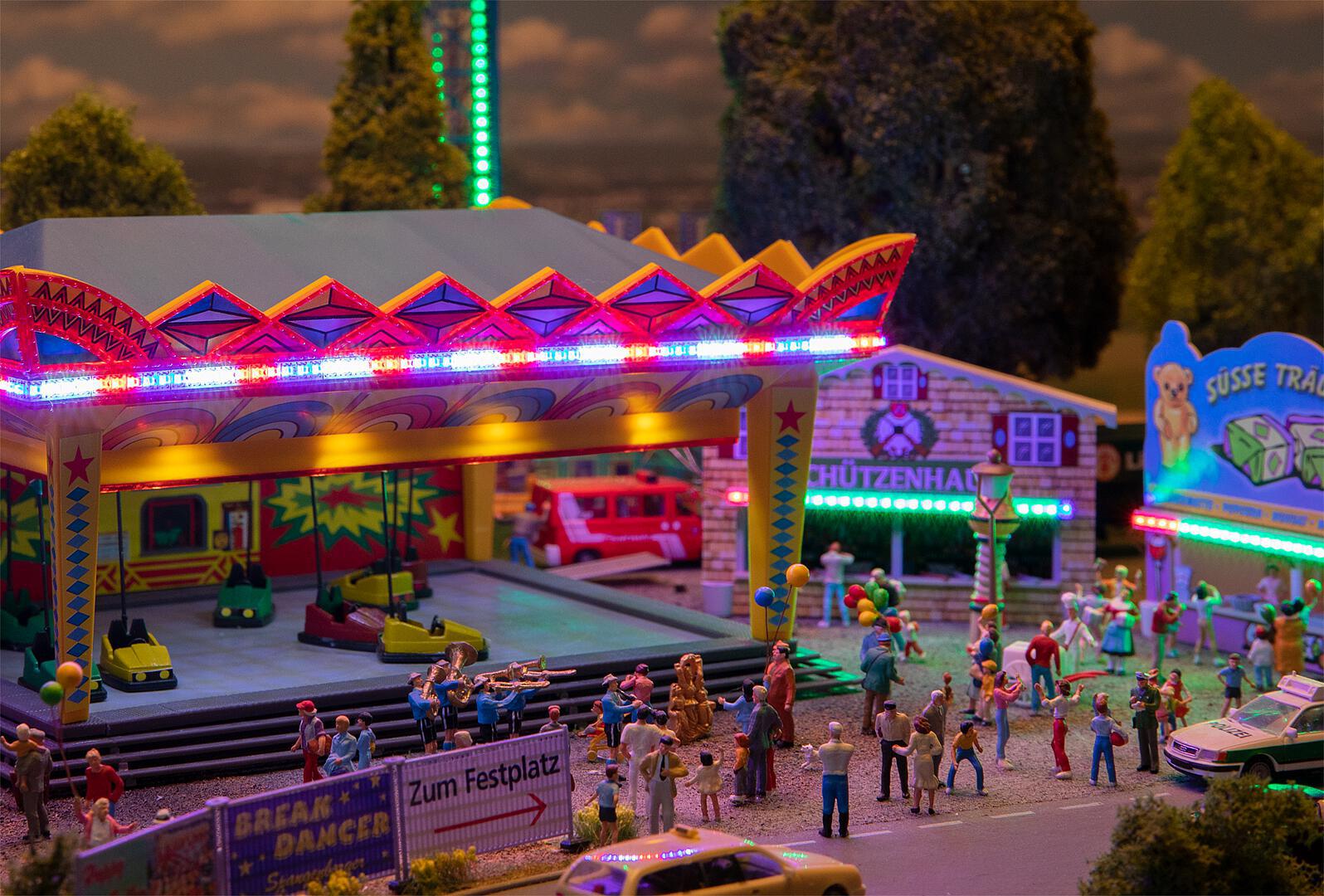 Smartes Lightstrip – Jetzt wird’s richtig bunt! Komplett-Set für die animierte Farb-Beleuchtung von Kirmes-Modellen, bestehend aus einem LED-Lichtstreifen mit Steuerung und Netzteil. – Flexibler 0,5 m-Lichtstreifen bestückt mit 150 einzeln adressierbaren RGB-LEDs – Sämtliche Lichtfarben und Farbtemperaturen verfügbar – Intuitive Steuerung über Smartphone-App oder mit beiliegendem Handgerät – Zahlreiche vorprogrammierte und veränderbare Lichtbilder – Farbauswahl, Helligkeit, Geschwindigkeit, Effektlänge, Laufrichtungen individuell einstellbar – Musiksteuerung durch Umgebungsgeräusche – Gleichzeitiger Betrieb von zwei unterschiedlichen Lichtbildern möglich – Timer für Zeitschaltungen Der Lichtstreifen lässt sich leicht biegen, formen und auf die gewünschte Länge (alle 16 mm) zuschneiden. Die Abschnitte sind wiederverwendbar. Ein Lichtstreifen lässt sich bis zu einer Länge von 2 m erweitern. »Smart-Effects-LED« Lichtstreifen-Verlängerung, 150 LEDs/0,5 m, Art. 180796 separat erhältlich. Technische Daten: – RGB-LEDs, Full Color, 24 Bit – Anzahl LEDs: 150 – Maße Lichtstreifen: 500 x 4 x 1,2 mm – Spannung: 5 V DC – App-Support: iOS 10.0 / Android 4.4 oder höher Batterie für RF-Fernbedienung Typ CR2025, 3 V enthalten.