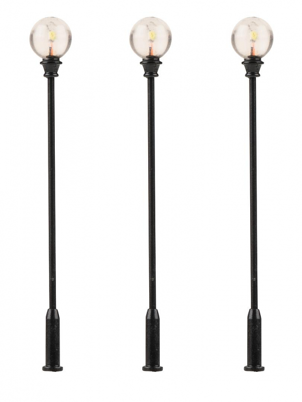 Kugel-Aufsatzleuchte 3-StückKlassische Kugel-Aufsatzleuchte. Geeignet zur Beleuchtung von Altstädten, Parks und historischen Szenerien. Die Kugelleuchte ist mit langlebiger LED-Technik ausgestattet. Der Mast ist aus Metall gefertigt und die Leuchtenhöhe variabel einstellbar. Höhe: 71 mm. Das Produkt ist anschlussfertig für 12 V Gleichspannung (DC). Nutzen Sie für den Betrieb der Leuchte den »Transformator«, Art. 180641.