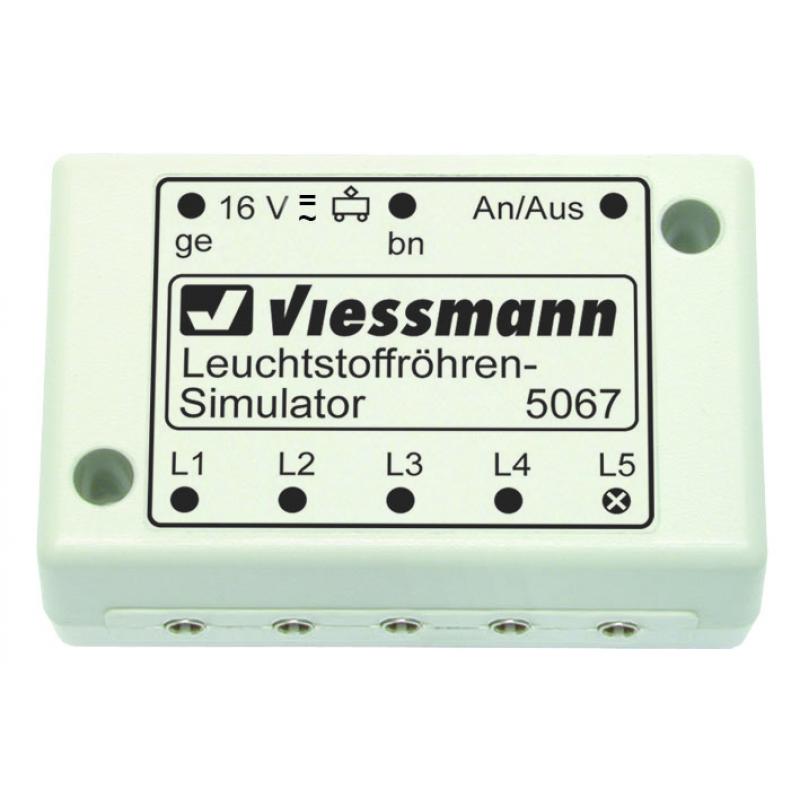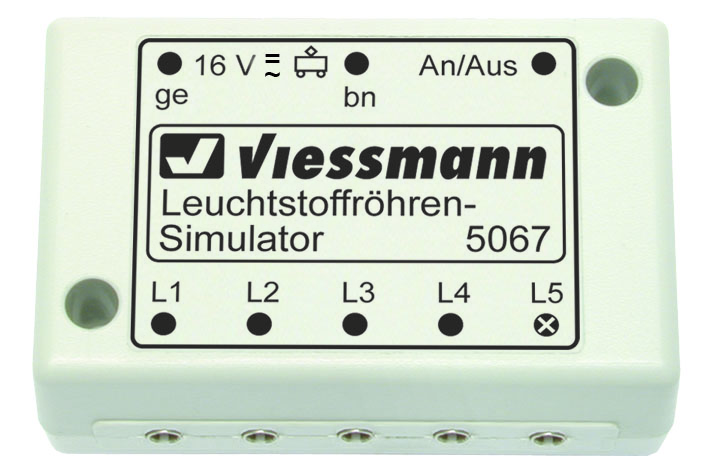 Elektronik zur realistischen Ansteuerung der Viessmann Leuchtstoffröhren-Lampenmodelle aller Baugrößen. Auch für LED-Leuchten geeignet. Nach dem Einschalten mittels Tasten-Stellpult flackern die einzelnen Röhren vorbildgerecht eine Zeit lang, bis sie nach und nach alle leuchten. Dabei ist jedes Zündmuster ein wenig anders. An einem der Ausgänge kann, in Verbindung mit dem Universal-Ein-Aus-Umschalter Art. 5550, eine defekte Leuchtstoffröhre simuliert werden. Diese flackert in unregelmäßigen Abständen kurz auf, wobei sie mal schnell und mal langsam hell wird. Das Modul verfügt über 5 separate Ausgänge mit unterschiedlichen Zündmustern. An jedem Ausgang können maximal 3 Lampen angeschlossen werden. Wir empfehlen jedoch, je Ausgang nur eine Lampe zu betreiben, da sich auch in der Realität nie 2 Lampen gleich verhalten. An / Aus erfolgt über einen separaten Taster, z. B. das Tasten-Stellpult Art. 5547.