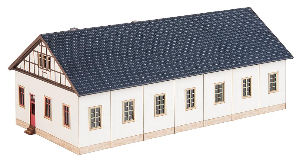 Lasercut-Modell nach dem Originalvorbild des denkmalgeschützten Depotgebäudes der Naumburger Straßenbahn. Der im Jahr 1840 als Reithalle erbaute und 1892 zum zweiständigen Straßenbahndepot umgebaute, rechteckige Bau mit umlaufendem Steinsockel, Sprossenfenstern, Fachwerkgiebel und grau gedecktem Satteldach gilt als das dienstälteste Straßenbahndepot. Tore beweglich. Vorbereitet für Oberleitungsbetrieb.