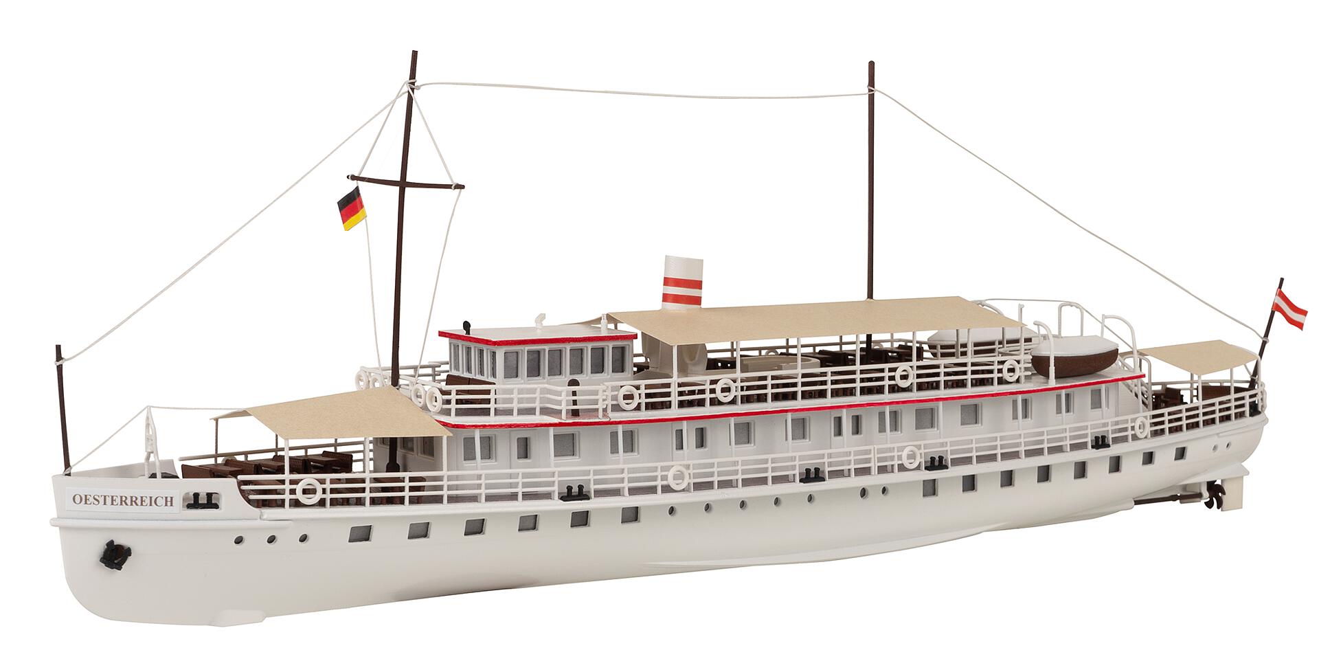 Maßstäbliches Modell des Art déco Bodensee-Fahrgastschiffes, das seit 1928 bis heute auf dem Bodensee verkehrt. Das Modell zeigt die heutige Bauform nach der Restaurierung 2019. Die historische Schifffahrt Bodensee GmbH wirbt auf Ihrer Seite: »Bezaubernd anmutig ist nicht nur das Äußere der Oesterreich. Wer die Gangway betritt, ihr langsam näherkommt, der spürt sofort die unglaubliche Leichtigkeit, die diesem Schiff innewohnt. Die Atmosphäre an Bord – prickelnd, anregend wie ein Glas Champagner. Spätestens nach dem ersten Rundgang, wenn man mit einem köstlichen Aperitif in der Hand an Deck der Oesterreich auf den See hinausgeleitet, ist jeder Gedanke an den Alltag verflogen. Nach der umfassenden Renovierung strahlt jedes Detail.« Wir sagen, genauso ist es. Ein wunderbarer Hingucker auf einer Modellanlage oder auch als Standmodell in der Vitrine.