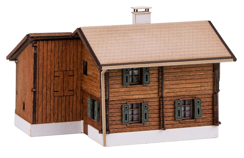 Lasercut-Bausatz nach dem Originalvorbild des Bahnwärterhauses im denkmalgeschützten Stationsgebiet von »Stugl-Stuls«. Das Modell des schlichten Blockbaus eignet sich auch für die Darstellung eines Einfamilien- oder Wochenendhauses in ländlich-bäuerlicher Bauweise. Die Wände des Modells sind aus gebeiztem Echtholz.