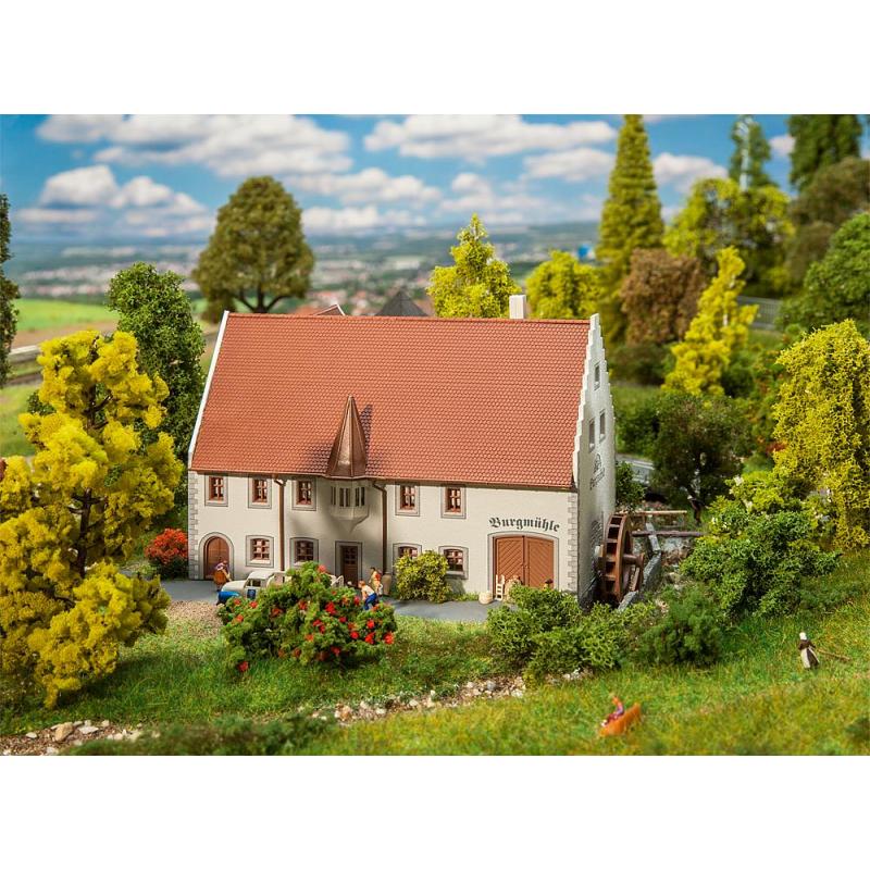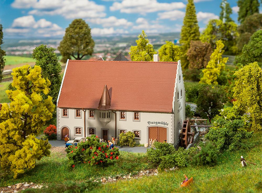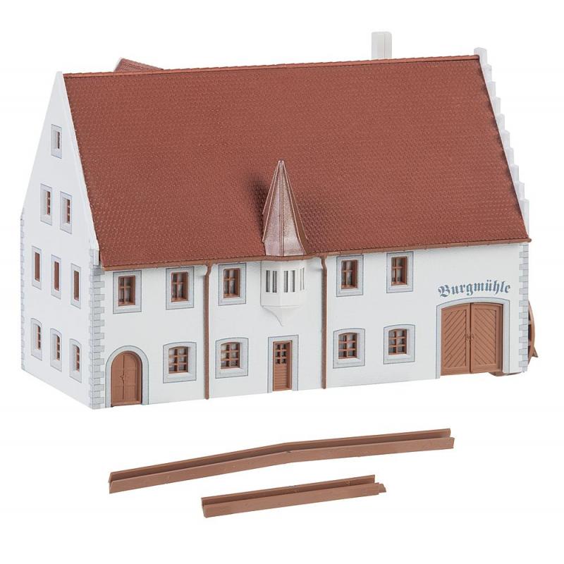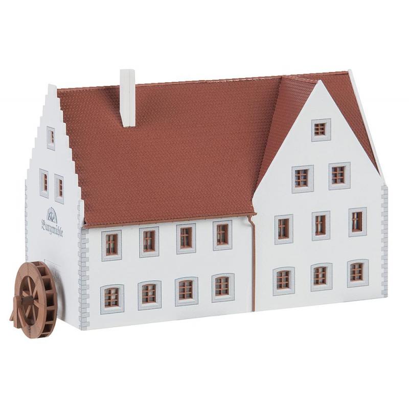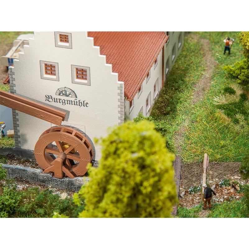 Mühlenfest, hurra! Traufständiges, zweigeschossiges Mühlenanwesen mit Ecksteinen, im Putz freigelegten Fenster- und Türgewänden, Erkertürmchen und drittem Giebel. An der rechten Gebäudeseite mit dem Staffelgiebel befindet sich das Wasserrad mit Anbringungsmöglichkeiten in verschiedenen Höhen und optionalem Antrieb mit dem Synchron-Bastelmotor, Art. 180629, nicht beiliegend.