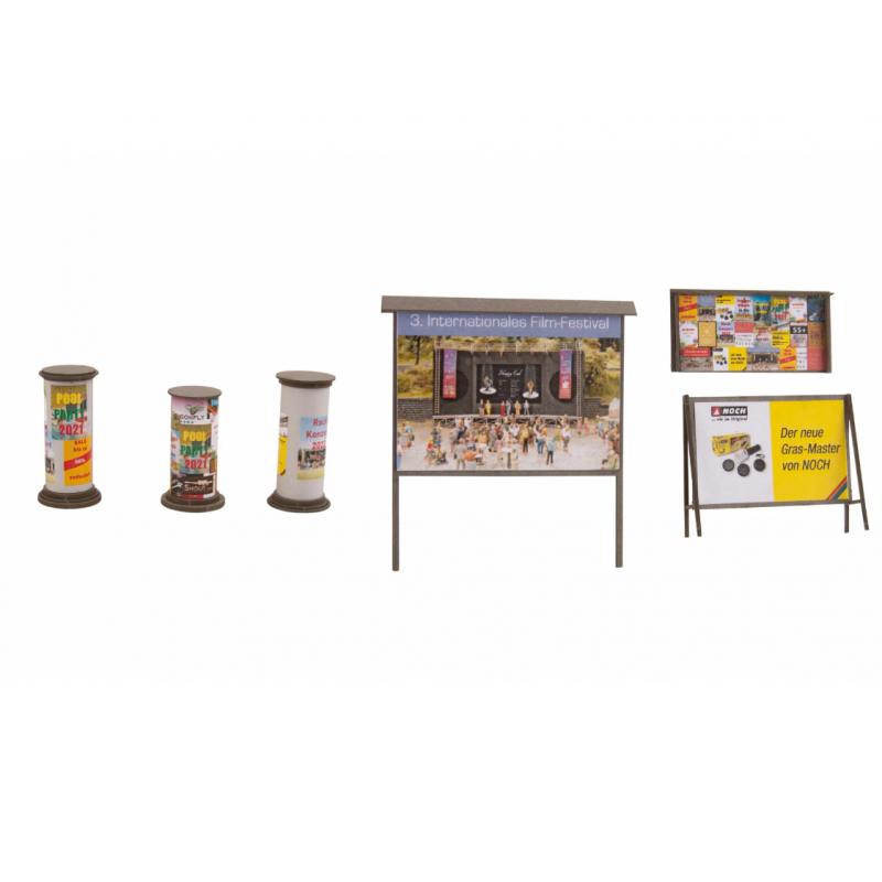 Die NOCH "Litfaßsäulen & Werbewände" eignen sich hervorragend, um besonders Stadtszenen auf einer Modelllandschaft ideal auszugestalten. Wer kennt es nicht: man bummelt durch die Stadt und schon die erste Werbewand macht mit einem großen Banner auf sich aufmerksam. Zu unterschiedlichen Themen wird Werbung gemacht: ob für Autos, Bekleidung, Urlaubsreisen, Zeitschriften, Flugreisen, Fernsehsendungen, Events oder auch die neusten Elektrogeräte, hier ist wirklich für jeden etwas dabei. So macht man direkt auf sich aufmerksam und zieht die Blicke der Passanten auf sich. Eine ideale Möglichkeit, um gezielte Werbung zu machen.
