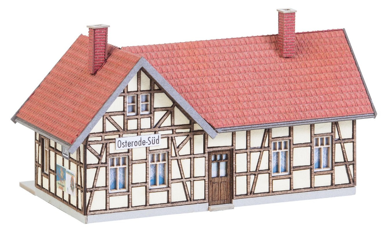 Lasercut-Modell nach dem Originalvorbild des ehemaligen Osteroder Südbahnhofs im Harz. Zur Gleisseite bietet der eingeschossige Fachwerkbau den Reisenden eine Wartemöglichkeit unter einem Vordach.