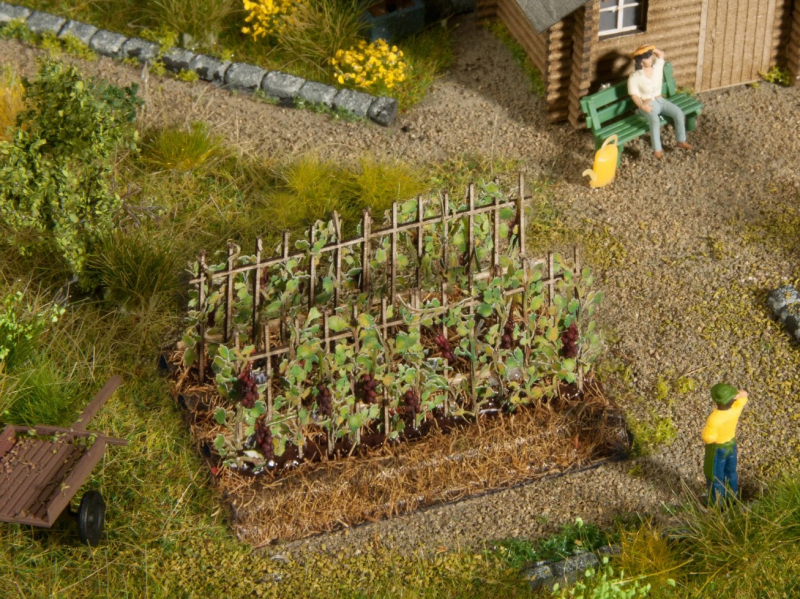 Deko-Minis sind einbaufertig ausgestaltete kleine Felder mit verschiedenen Pflanzen. Sie werden einfach aus der Verpackung genommen und in die Modelllandschaft eingeklebt. Die "Weinreben mit blauen Trauben" sind an zwei Rank-Gestellen angebracht und sorgen für einen echten Hingucker auf Ihrer Modellbahnanlage.