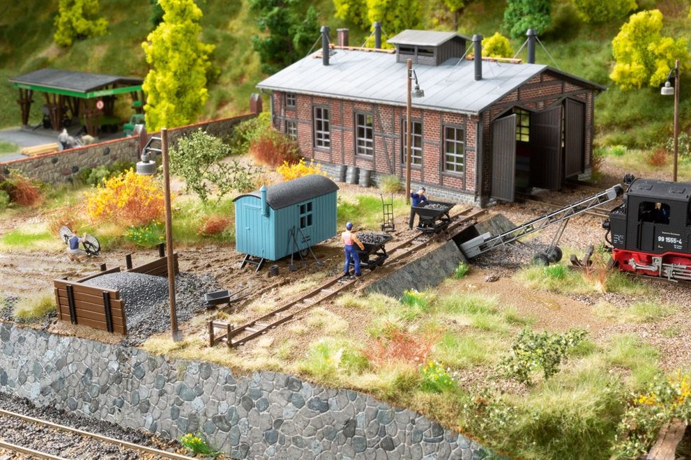 Tausendfach fotografiert wurde die archaische Bekohlung der Schmalspurlokomotiven am Ausgangspunkt der Preßnitztalbahn bis Ende 1986 mittels Kipploren und Förderband. Mit zwei Kipploren, geradem und gebogenem Gleis (640 mm Gesamtlänge), einem Förderband und einem Aufenthaltswagen mit vorbildnaher Bereifung und Bedruckung sowie dem Kohlebansen nebst nötigem Werkzeug kann die Szene dem Vorbild nachempfunden werden. Auch für kleinere Regelspurdampflokomotiven geeignet. Bauwagen 58 x 22 x 35 mm, Kohlebansen 61 x 32 x 15 mm, Förderband 75 x 15 x 35 mm, Kipplore LüP 19 mm
