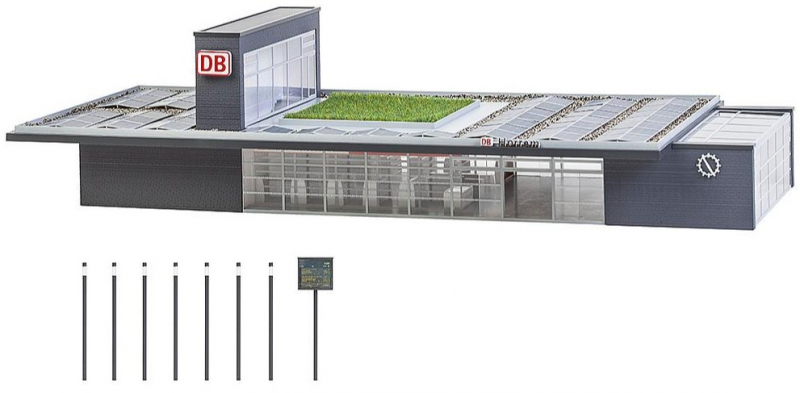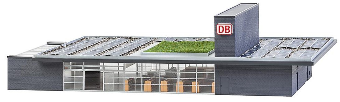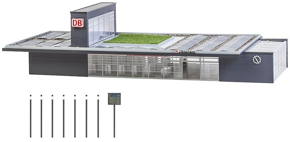 Neue Standards für das Empfangsgebäude Ihrer Bahn! Originalgetreues Modell nach dem Vorbild des »Grünen Bahnhofs« in Kerpen-Horrem in Nordrhein-Westfalen an der Regionalexpress-Strecke zwischen Köln und Aachen. Das Leuchtturmprojekt der DB Station&Service AG ist die erste ganzheitlich unter Umwelt-, Energie- und Klimaaspekten gebaute Station. Während die klare Gliederung und zurückhaltende Farbgebung des Schieferbaus den Zügen den großen Auftritt überlässt, sorgen großflächig verglaste Fassaden- und Dachflächen für Transparenz und optimalen Tageslichteintrag für die Reisenden in der zentralen, stützenfreien Halle mit Wartebereich. Photovoltaik für die Nutzung von Sonnenenergie sowie die Begrünung der unterschiedlich lang auskragenden Dachflächen runden das ökologische Erfolgsmodell ab. Sitzelemente, moderne Laternen und Zuganzeiger liegen dem Bausatz bei.