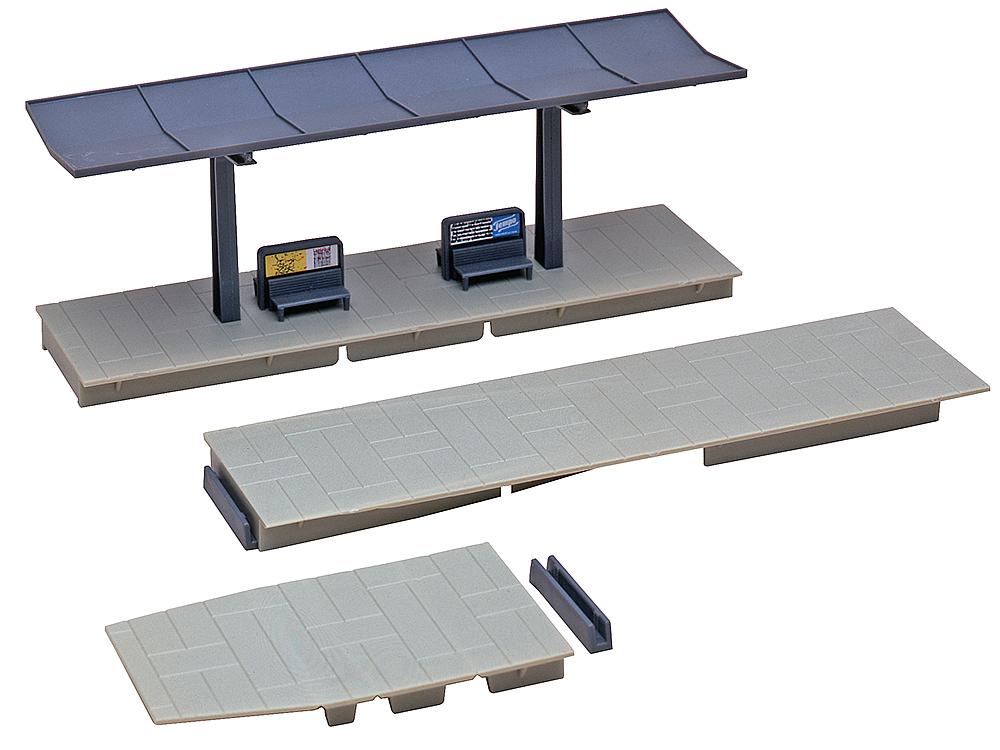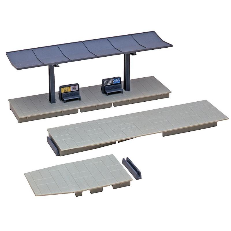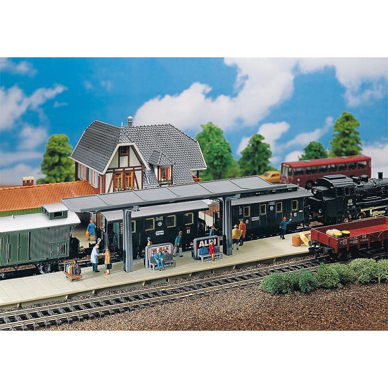 Überdachter Bahnsteig mit 2 Ansatzstücken. Für alle Gleisarten.