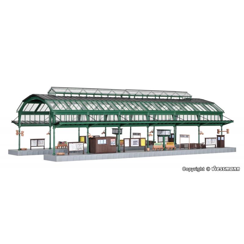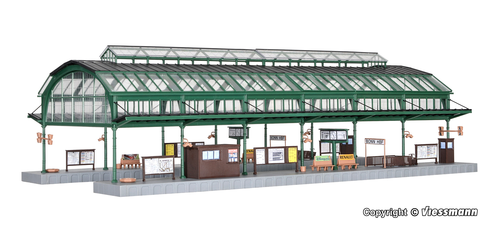 Kibri H0 - Bausatz. Diese gigantische Bahnsteighalle passt wunderbar zum Modell des großen Bahnhofs Bonn Art. 39373. Gleise und Bahnsteige werden hier von einer interessanten Hallenkonstruktion raumwirksam überdeckt. Das Eisen-Glas-System ist auch im Modell hervorragend nachempfunden. Das Konzept folgt in der Zusammenstellung einem Großstadtbahnhof im H0-Maßstab. Mehrere Hallen können in beliebiger Länge und Breite hinter- bzw. nebeneinander aufgebaut werden, wobei sie je nach Wunsch oder vorhandener Anlage als Durchgangs- oder Kopfbahnhof eingesetzt werden können. Der Aufbau der gewölbten Dachkonstruktion bereitet im Modell keine Schwierigkeiten, lediglich die Montagereihenfolge der einzelnen Dachteile spielt eine Rolle. Geeignet für den Aufbau mit der Viessmann-Oberleitung. Geeignet für Modellgleise und Märklin C-Gleis. ICE-Erhöhung liegt bei. Durchfahrtshöhe: 5,5/11,5 cm. Durchfahrtsbreite: 11,5 cm. Maße: L 44 x B 22,3 x H 13,5 cm. Schwierigkeitsgrad: 2 (Fortgeschrittene).