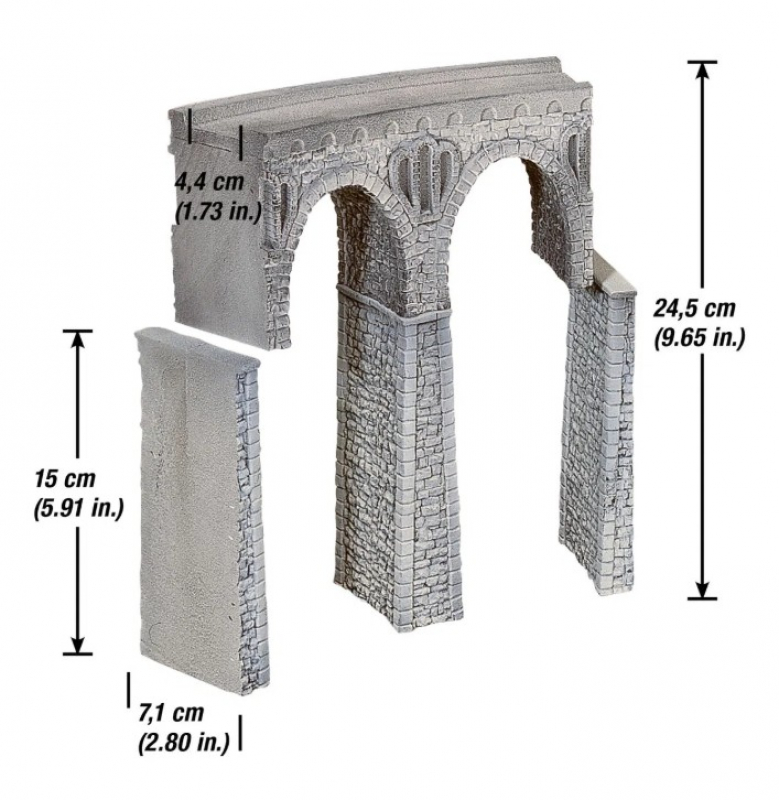 Das gebogene "Bruchsteinviadukt" ist der Blickfang für Ihre Modellbahnanlage. Es stehen die beiden gängigen Radien R1 (360 mm, 30°) und R2 (437,5 mm, 30°) zur Wahl. Sechs gebogene Bruchsteinviadukte aneinandergesetzt ergeben einen Halbkreis. Selbstverständlich können die gebogenen "Bruchsteinviadukte"ideal mit dem geraden "Bruchsteinviadukt"bzw. mit dem Rhône- Viadukt kombiniert werden.