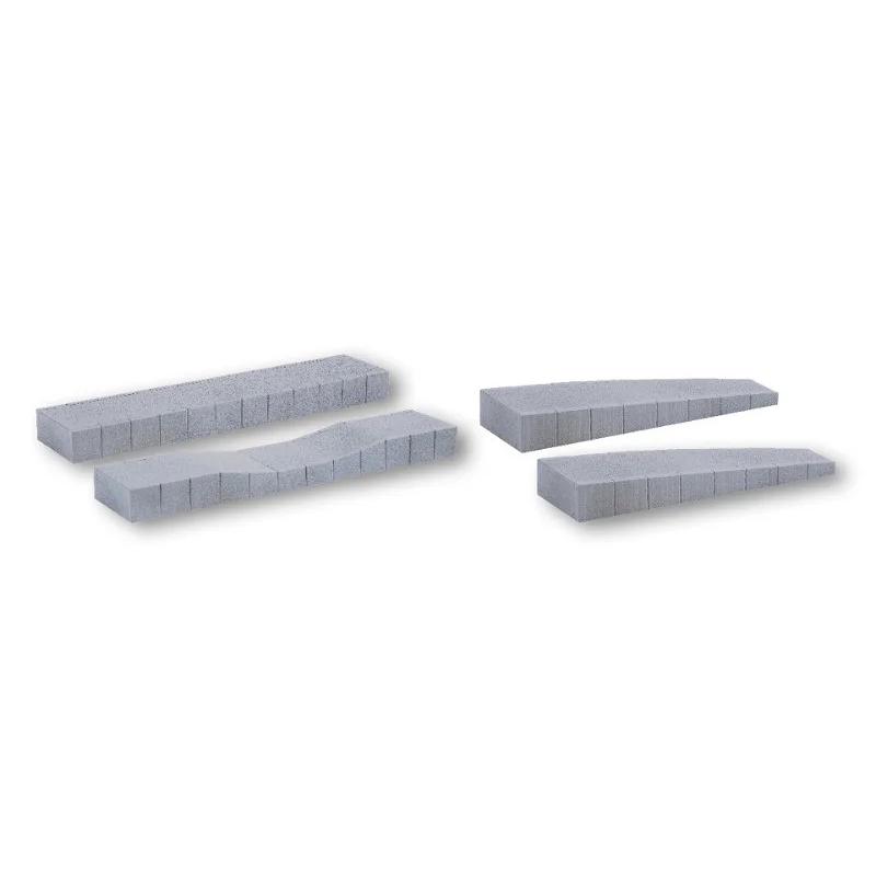 Gerader Bahnsteig, 18 cm langGerader Bahnsteig mit Gleisabgang, 18 cm langJe 1 Bahnsteigende mit gebogenem Ende links und rechts, je 12 cm langDurch die Kombination dieser Elemente lassen sich alle erdenklichen Bahnsteigsituationen im Modell erbauen: