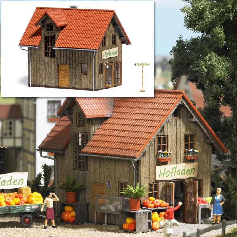 Originelles Holzgebäude mit prägnanter Dachgaube als Hofladen für selbst produziertes Gemüse und Salat, Brot, Honig, Marmelade, Fruchtsäfte, Obstbrände usw. Holzflügeltüren zum Öffnen. Mit bedrucktem Ladenschild und Holzwegweisern »Hofladen«. Universell verwendbar z.B. auch als Öko-Haus, kleines Heimatmuseum, Naturschutzzentrum und Ähnliches. Bausatz. Perfekte Ergänzung: Hofladen-Ausgestaltung H0 1075.Größe: 85 x 67 mm, 73 mm hoch.Durch einen stabilen, zusammensteckbaren Unterbau, der mit den fertig geschnittenen und kolorierten Teilen verkleidet wird, ist der Zusammenbau besonders einfach. Zusätzlich sind lediglich ein Bastelmesser und Modellbaukleber (z.B. Busch 7599) oder Alleskleber (z.B. UHU® Kraft) erforderlich.