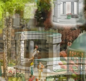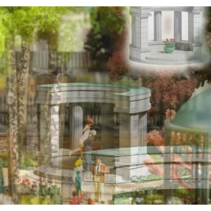Historischer Säulenbogen für einen Friedhof oder Parkanlage. Mit eckigen und runden Säulen sowie Reliefboden. Der Säulenbogen ist an der Oberseite mit einer patinierten Kupferdacheindeckung in typischem Grün ausgestattet, ein Pflanzkübel mit Bepflanzung sowie eine kleine Echt-Holz-Sitzbank ergänzen den Innenbereich. Bausatz. Größe: 60 mm x 60 mm, 42 mm hoch.