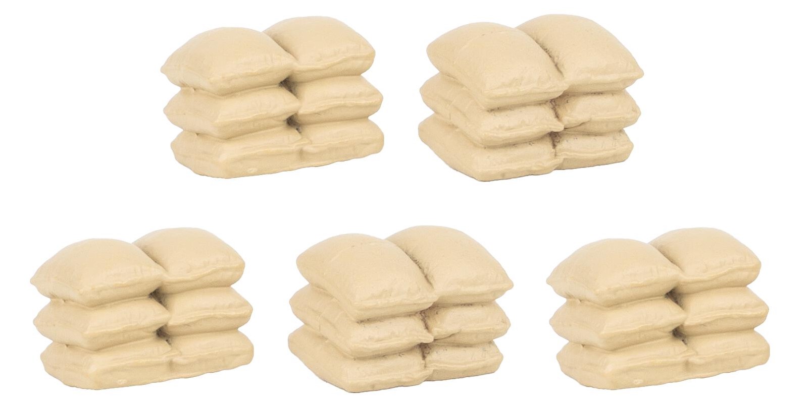 Ordnung muss sein! Fünf realistisch modellierte Stapel mit hellen Stoffsäcken eignen sich hervorragend zur Ausgestaltung von Lagerräumen, Güterhallen oder ländlichen Szenen. Ob Getreide, Mehl oder anderes Schüttgut – diese kleinen Details beleben die Modellwelt.