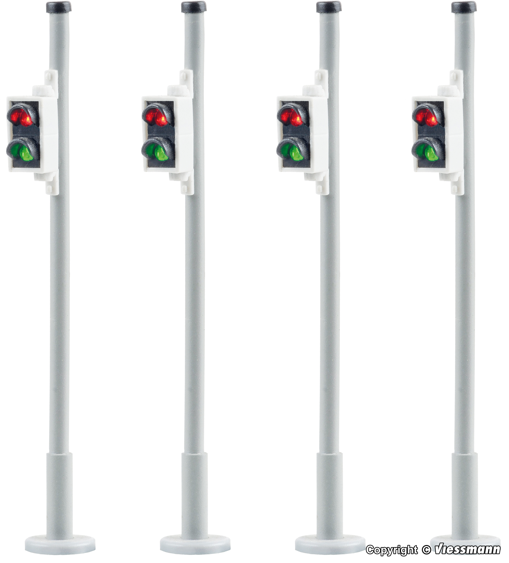 Fußgängerampeln im Stil der Epochen III – VI. Dieses Set besteht aus 4 Fußgängerampeln mit je einer roten und grünen LED. Sie dienen zum Absichern von Fußgängerüberwegen an Kreuzungen. Vorbildgetreuer Messingmast mit Steckfuß für eine besonders einfache Montage. Wartungsfrei dank LED-Beleuchtung. Die Fußgängerampeln können in Verbindung mit den Ampeln Art. 5094 und 5095 betrieben werden. Die Ansteuerung erfolgt über die jeweils enthaltene Elektronik. Für eine Kreuzung (2 Straßen) werden 2x Art. 5095 oder 2x Art. 5094 und 1x Art. 5096 benötigt. Höhe: 4,1 cm.