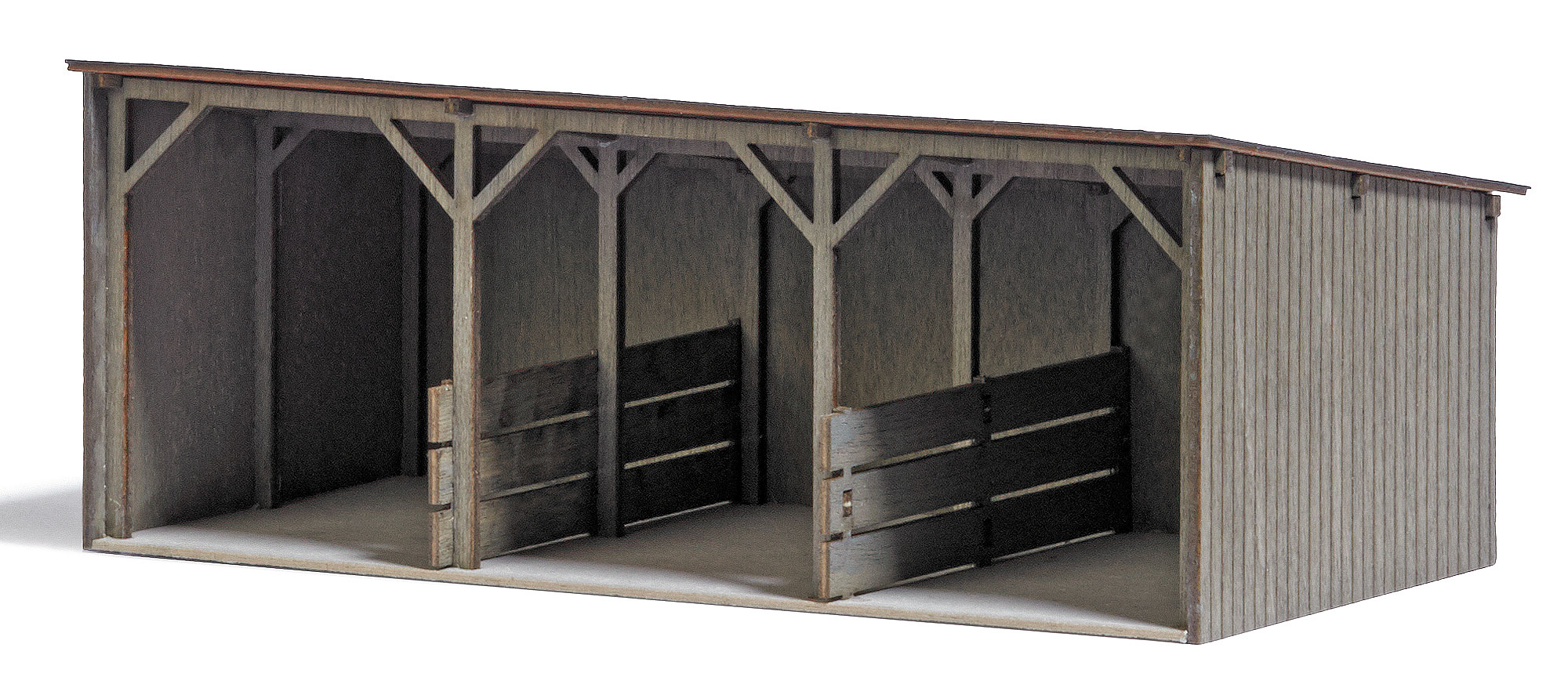Einseitig geöffneter Unterstand für landwirtschaftliche Fahrzeuge und Zubehör auf einem Feld oder Weide. Auch als Bootswerkstatt an einem See u.v.m. geeignet. Echt-Holz-Bauweise mit bereits fertig kolorierten Holzteilen. Bausatz. Größe: 123 x 65 mm, Höhe: 46 mm.