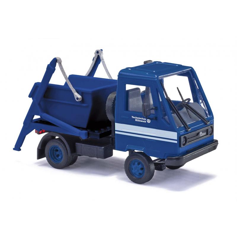 Blaues Einsatzfahrzeug mit markanter weißer Bauchbinde des Technischen Hilfswerks. Dort wird das Multicar zum Abtransport verschiedener Dinge eingesetzt. Gerade in Gebieten nach Hochwasser, in denen viel Unrat angeschwemmt wird, zieht man das wendige Fahrzeug gerne zur Arbeit heran.
