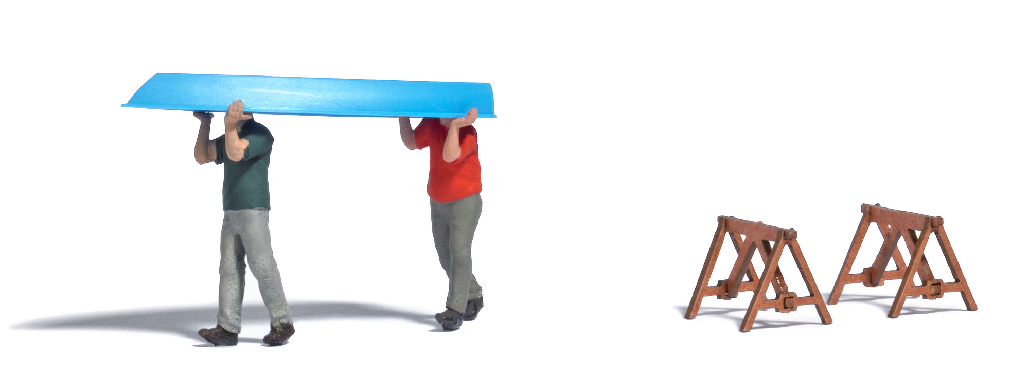 2 Männer, die ein Boot tragen. Mit Boot und Reparaturböcken.
