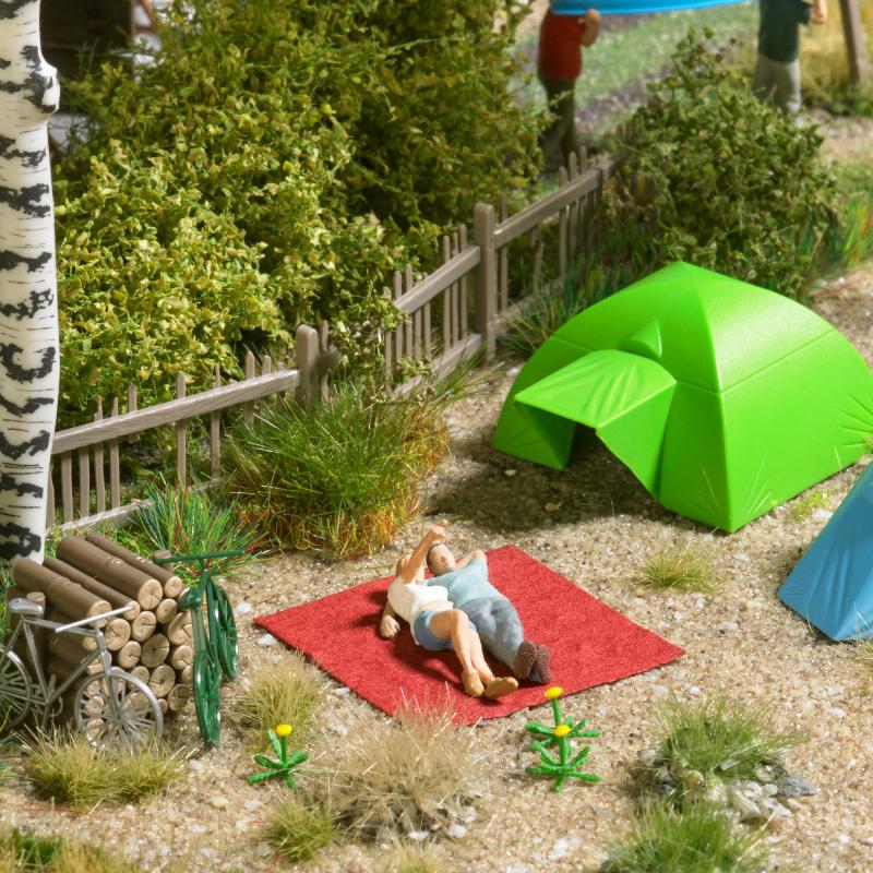 Nach der anstrengenden Fahrradtour zum Zeltplatz ruht sich das Pärchen erst mal aus.Mit 2 liegenden Figuren, großer Liegedecke, 2 Fahrrädern mit filigranen Speichen, Zelt und Holzstapel.