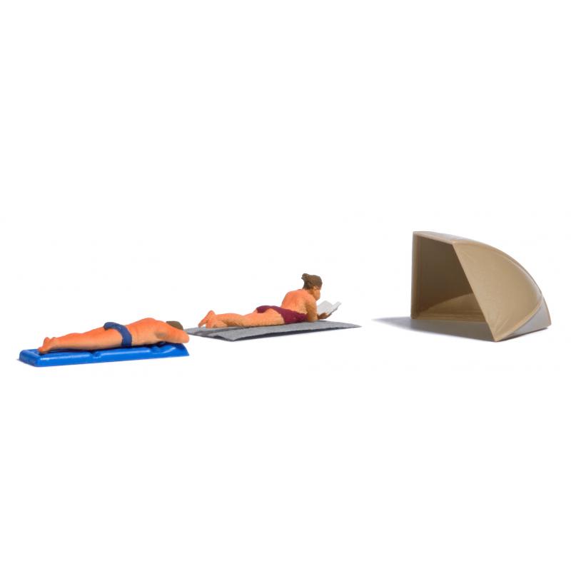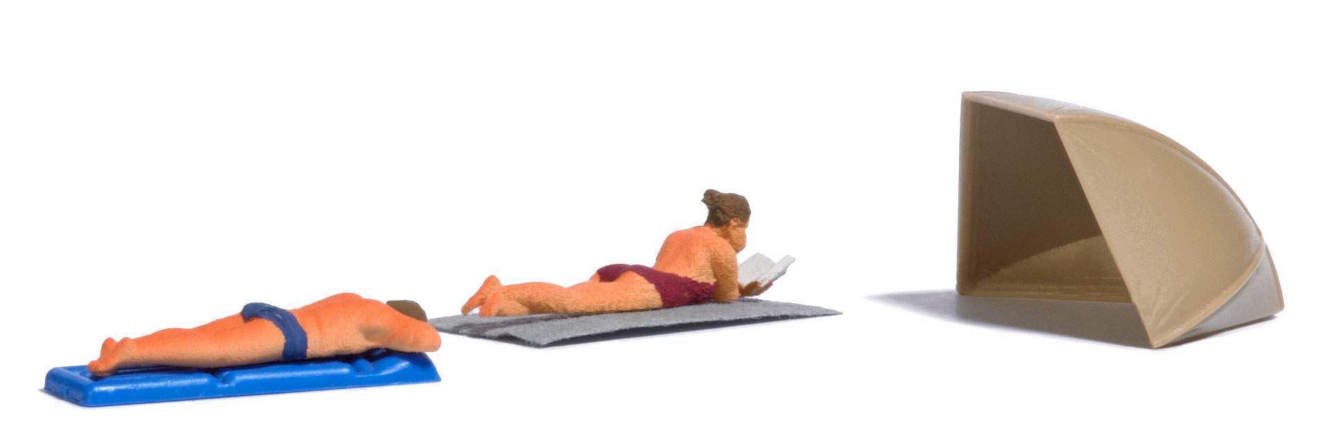 Zu spät! Dieses Paar liegt schon viel zu lange in der Sonne – ohne Sonnenschutz! Das Ergebnis ist auf der Haut der Sonnenanbeter bereits deutlich zu erkennen.Da hilft nur noch die Nachsorge mit »Après Sun«. Mit Luftmatratze, Liegetuch und Strandmuschel.