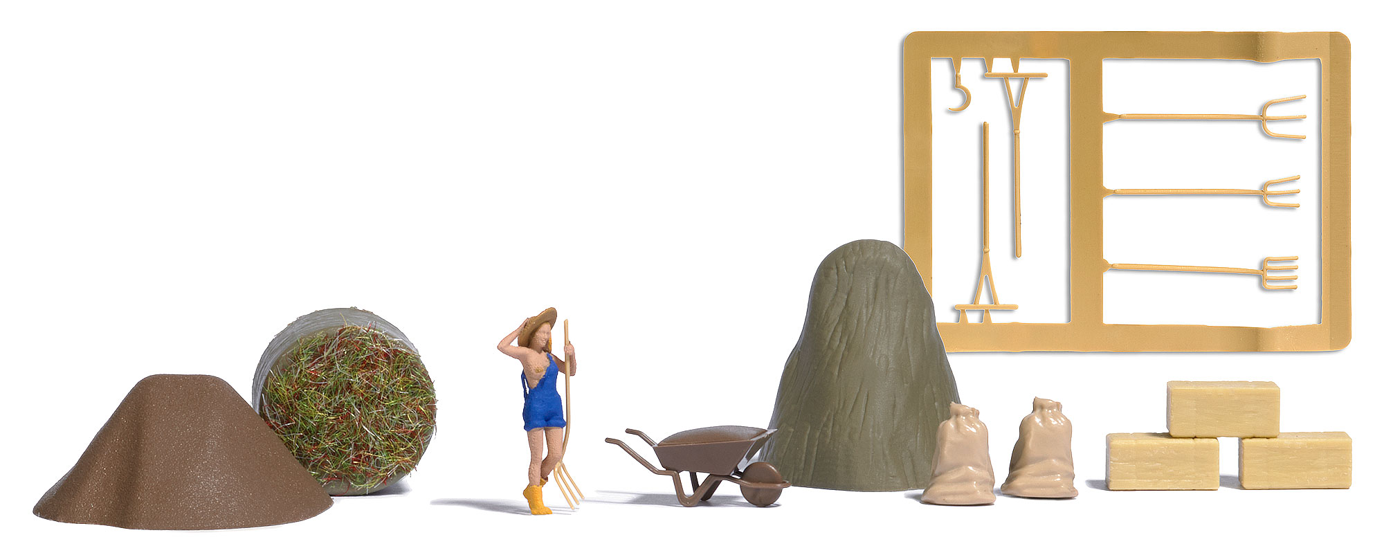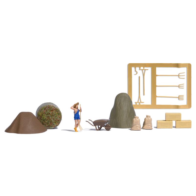 Freizügig gestyltes Model mit Zubehör für die Heuernte: Heuhaufen, Strohballen, Säcke und Stallwerkzeug. Auch für Foto-Shootings geeignet, passende Fotografen: H0 79810.
