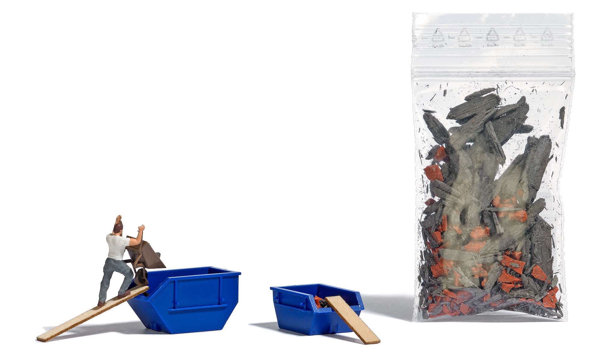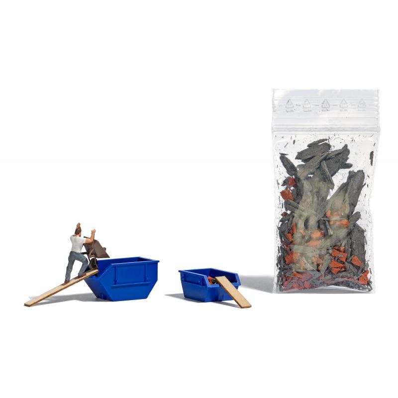Arbeiter, der Absetzmulden mit einem Schubkaren befüllt.Mit Absetzcontainer 1,5 m3 und Absetzcontainer 2,5 m3 sowie 2 Holzdielen und Bauschutt.