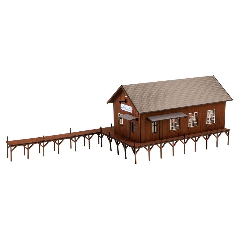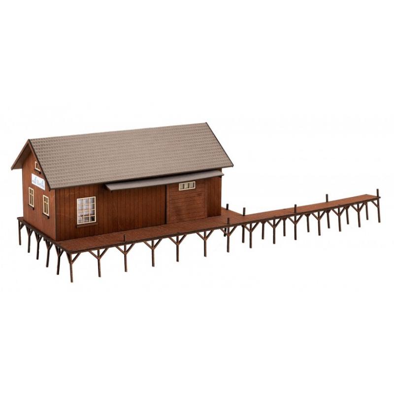 Wasserlage! Lasercut-Modell aus Holzwerkstoff und Spezialkarton eines Bootshauses auf Pfählen mit weißen Sprossenfenstern, kleinen Vordächern und einem auf drei Seiten umlaufenden Steg sowie einem Landesteg.