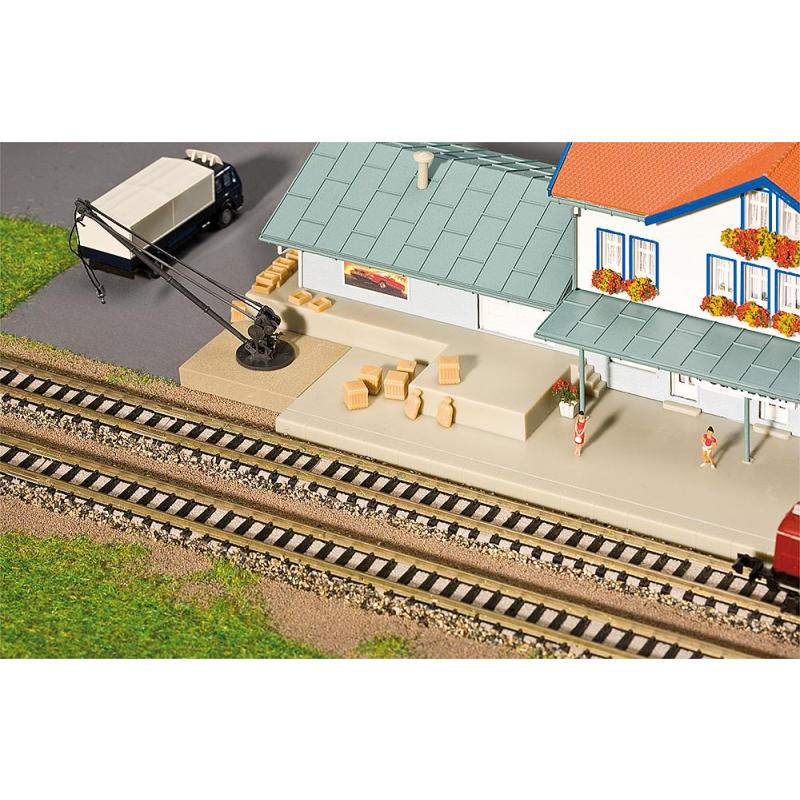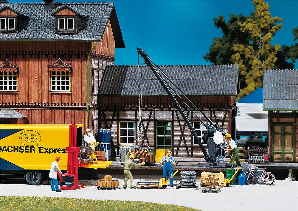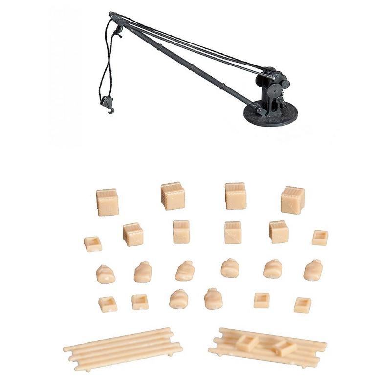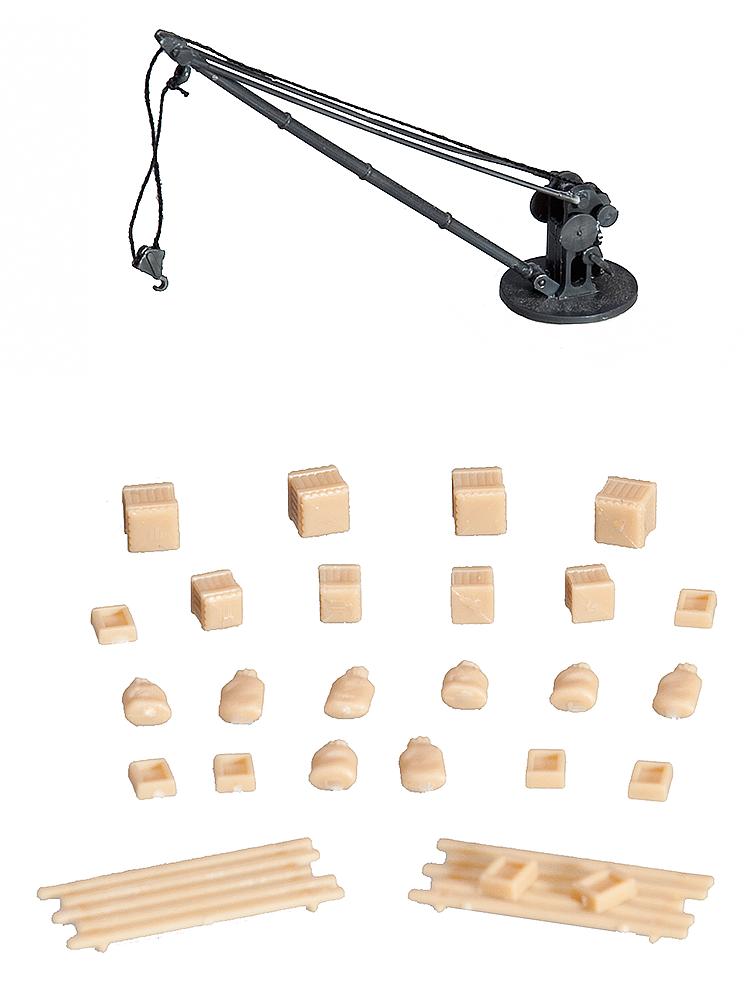 Manuell drehbarer Verladekran. Ohne Hebe- und Senkfunktion. Diverse Ladegüter liegen bei.