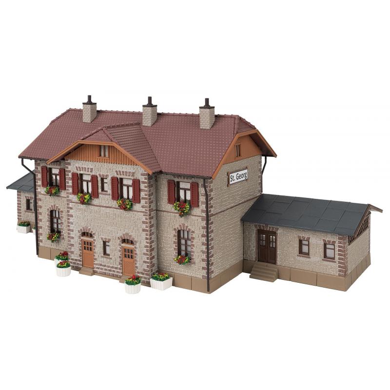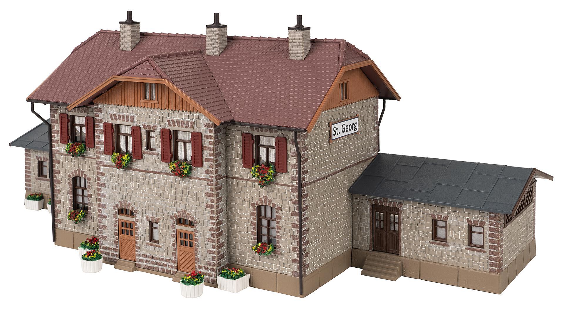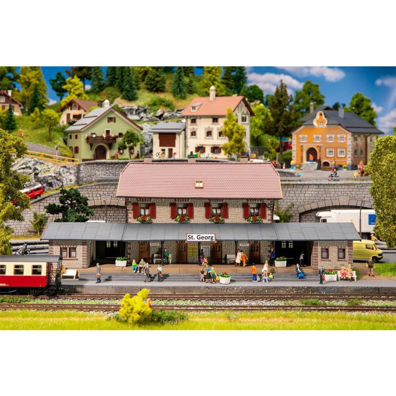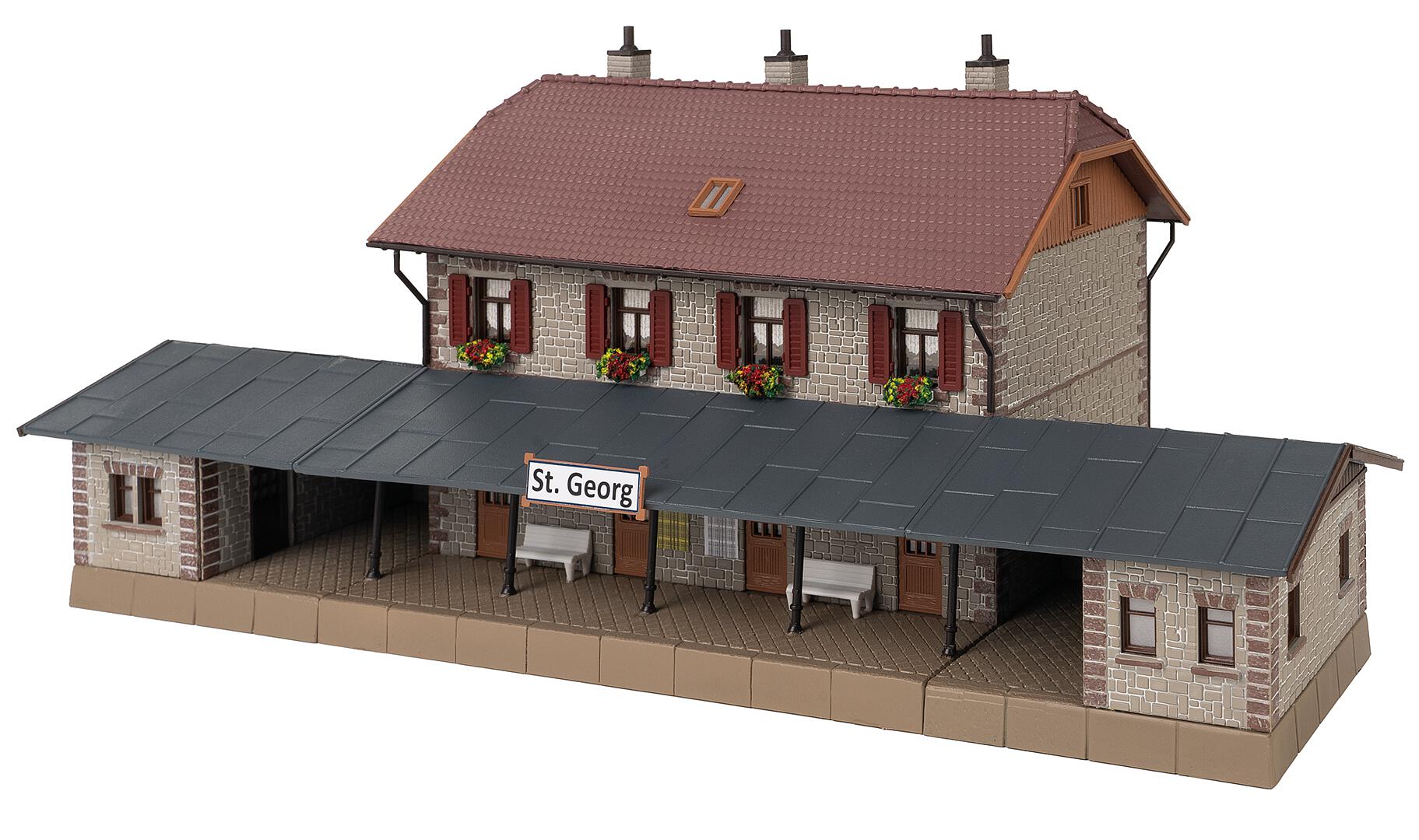 Typischer kleinstädtischer Bahnhof in natursteingemauerter Ausführung. Üppig ausgestattet mit einem überdachten Bahnsteig und dazu passenden Wartebänken.