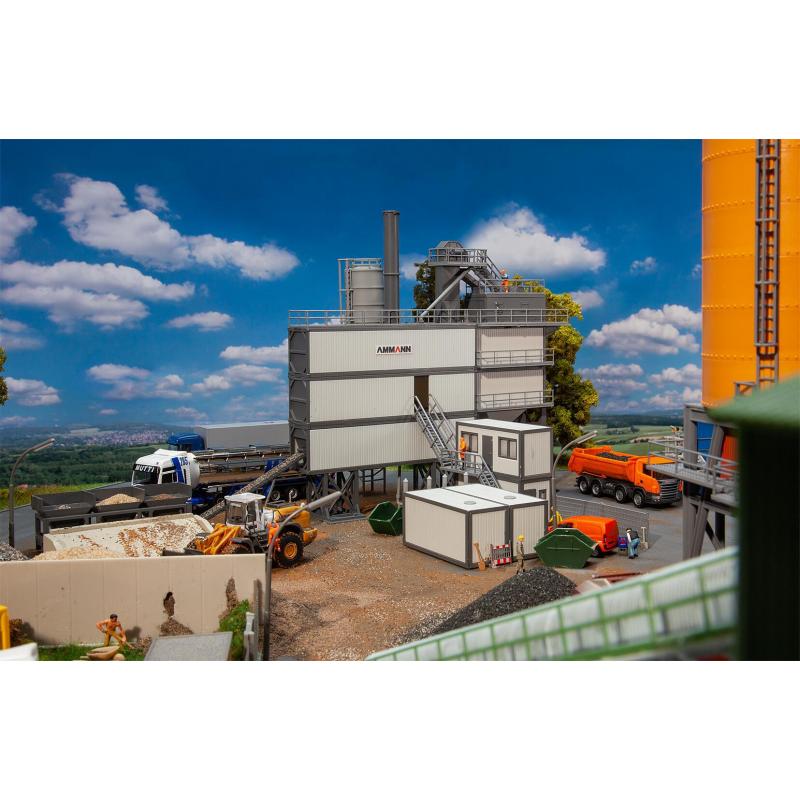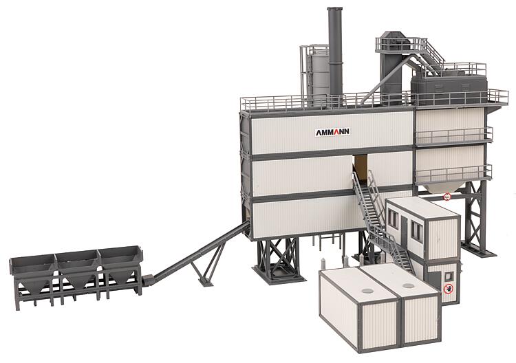 Auf die Mischung kommt es an. Versetzbares Asphaltmischwerk nach einem Originalvorbild des Schweizer Baumaschinenherstellers »Ammann Group Holding AG«. Für den effizienten Transport der mobilen Anlage sind Kernkomponenten, wie Vordoseure, Trockner- und Filtereinheiten, Mischturmmodule, Tanks, Pumpen und der Steuerungsraum in Gehäusen untergebracht, die gleichzeitig auch als Versandcontainer dienen. Ein Heißmineralsilo, ein Verladesilo für den Umschlag des Mischguts auf LKW, ein Elevator, Laufstege, Geländer und viele weitere Details komplettieren das Modell. Die Aufstellung erfolgt ohne ein Fundament. Geeignet für Car System und Car System Digital.