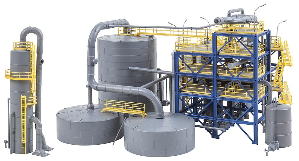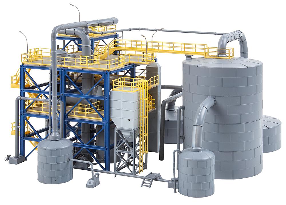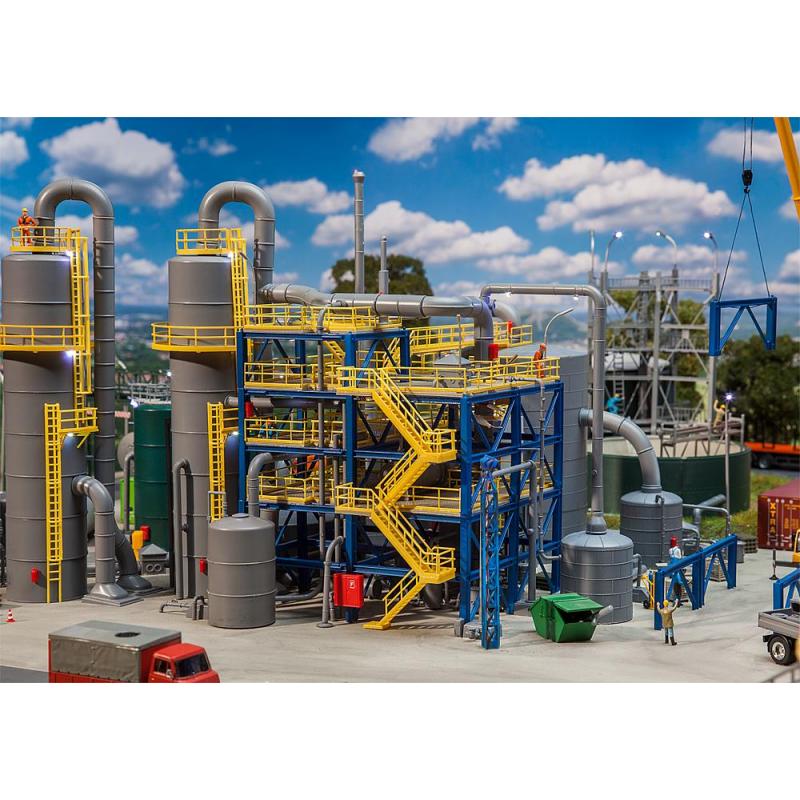 Megaplant im Mini-Maßstab. Produktionsanlage der chemischen Industrie, mit großem Tank und Reaktor, in dem der Einsatzstoff zu einem Produktgemisch reagiert, das anschließend durch unterschiedliche Siedepunkte in einer Kolonne getrennt wird. Verdampfte Flüssigkeiten und Gase werden über Wärmeaustauscher kondensiert und über Rohrleitungen zur Lagerung in Tanktassen geleitet, die als Auffangvolumen dienen. Die Lagerung und Bedienung von weiteren notwendigen Maschinen, Pumpen, Luftkühlern oder Kompressoren erfolgt in dem freistehenden, mehrgeschossigen Apparategerüst, das über Treppen und Steigleitern erschlossen wird. Der Bausatz ist modular erweiterbar, z.B. mit der »Kolonne mit Rohrleitungen«, Art. 130177.