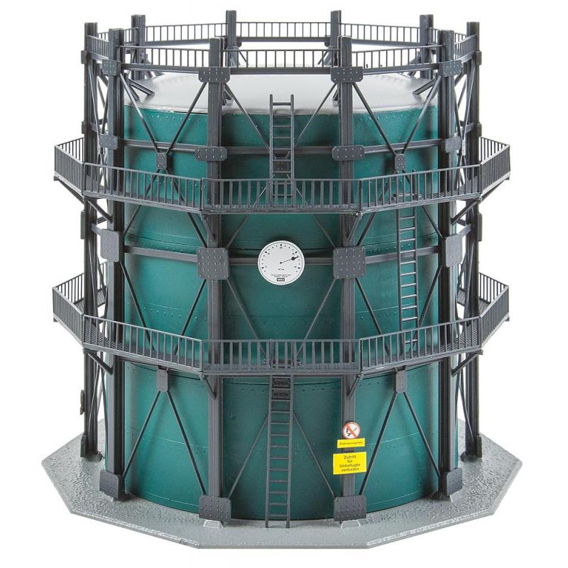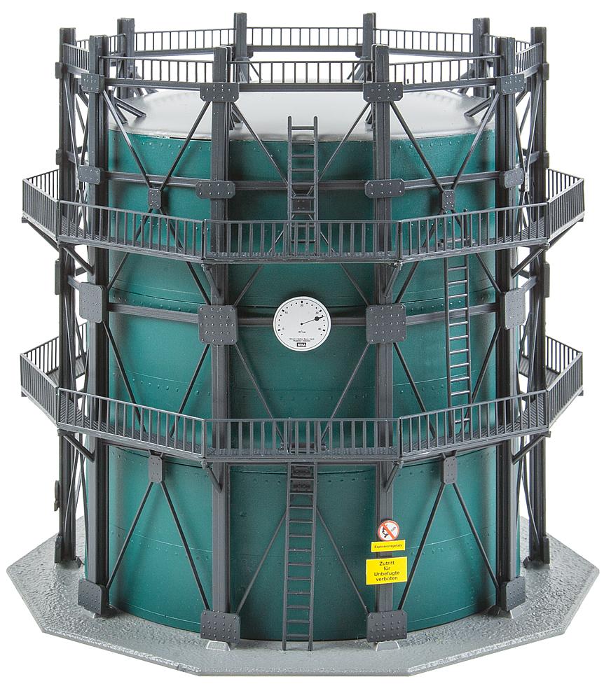 Industriedenkmal! Oberirdischer Behälter für die Speicherung von brennbaren Gasen, mit Stahlgerüst, drei begehbaren Umgängen und großer Messuhr an der Außenwand für die Anzeige des Füllstands.