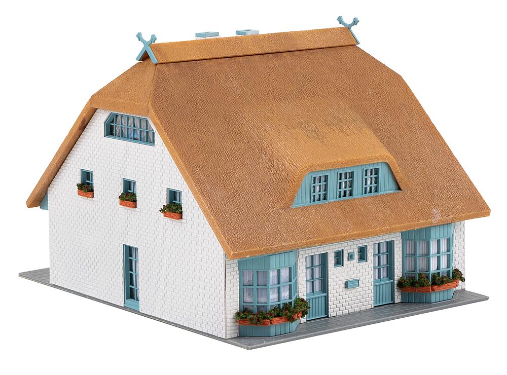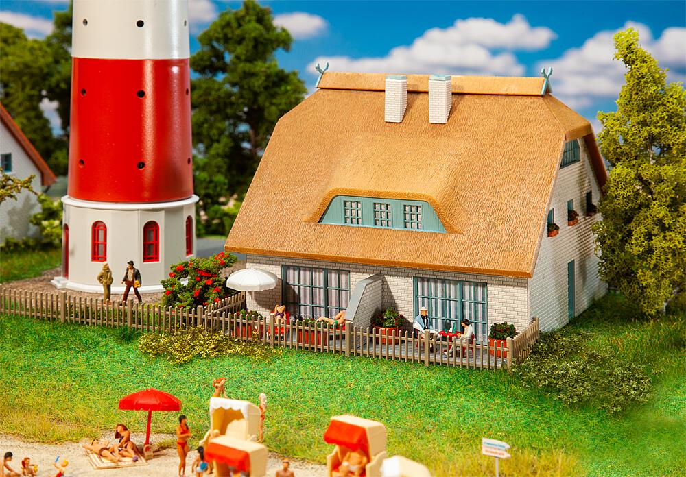 Norddeutsches, einstöckiges Wohnhaus mit heller Klinkerfassade, blauen Fenstern und Wintergartenanbauten und einem tief herabgezogenen, an den Schmalseiten abgewalmten Reetdach mit Reetfirst, zwei großen Gauben und gekreuzten Pferdeköpfen als Giebelschmuck. Für die Grundstückseinfassung liegt ein Lattenzaun bei.