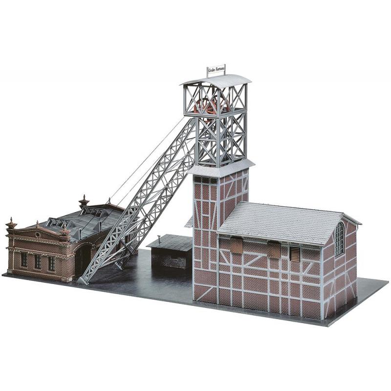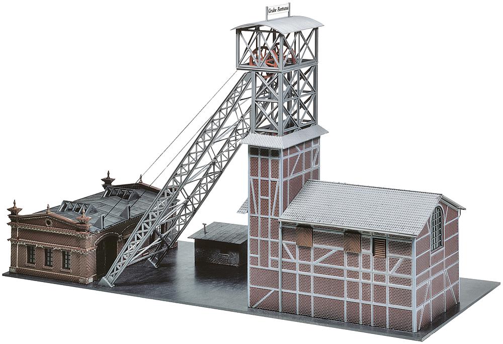 Eine Kohleförderanlage mit Schachthalle und doppeltem Förderturm mit zwei Seilscheiben, die durch Zukauf des FALLER-Motors (Art. 180629, 12-16 V, Wechselspannung) angetrieben werden können.