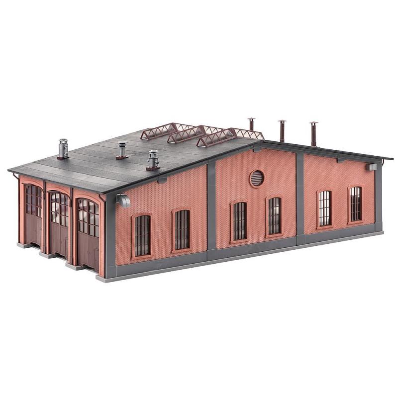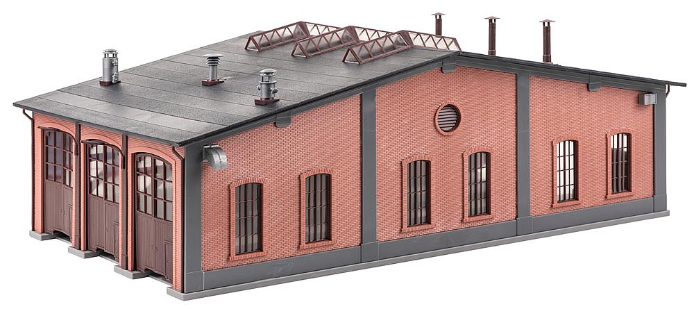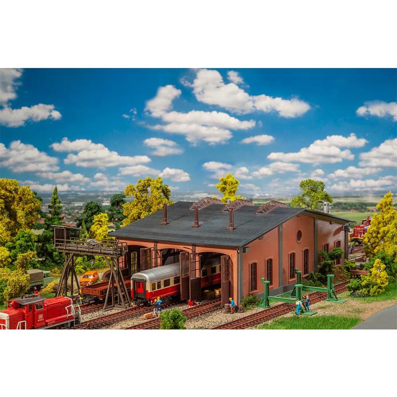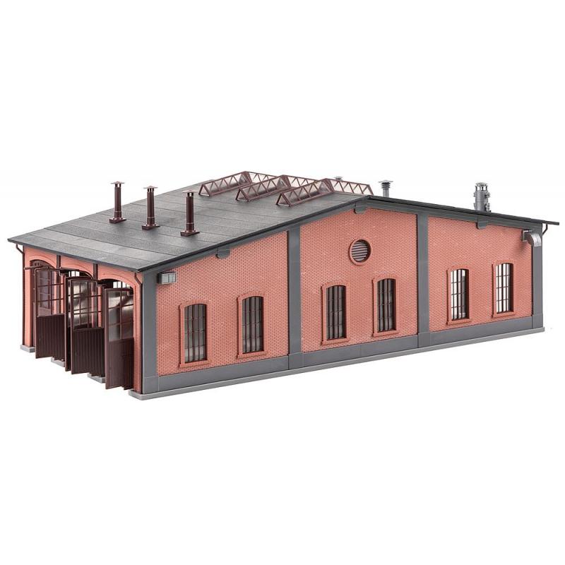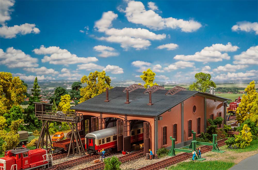 3-teiliges Set, bestehend aus einer dreiständigen Reparaturhalle ( Lokschuppen ) mit rotem Ziegelmauerwerk, beweglichen Toren und Durchfahrtsmöglichkeit, einem stationären Bockkran und zwei Spindelhebeböcken für die Wartung und Instandsetzung der Schienenfahrzeuge.