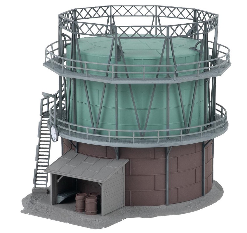 Mit seinem kompakten, aber markanten Erscheinungsbild fügt sich dieser kleine Stadtgaskessel perfekt in jedes Werks- oder Stadtmodell ein. Als Teil der historischen Energieversorgung verleiht der grün-braune Behälter der Anlage einen authentischen Hauch von Industriecharme.