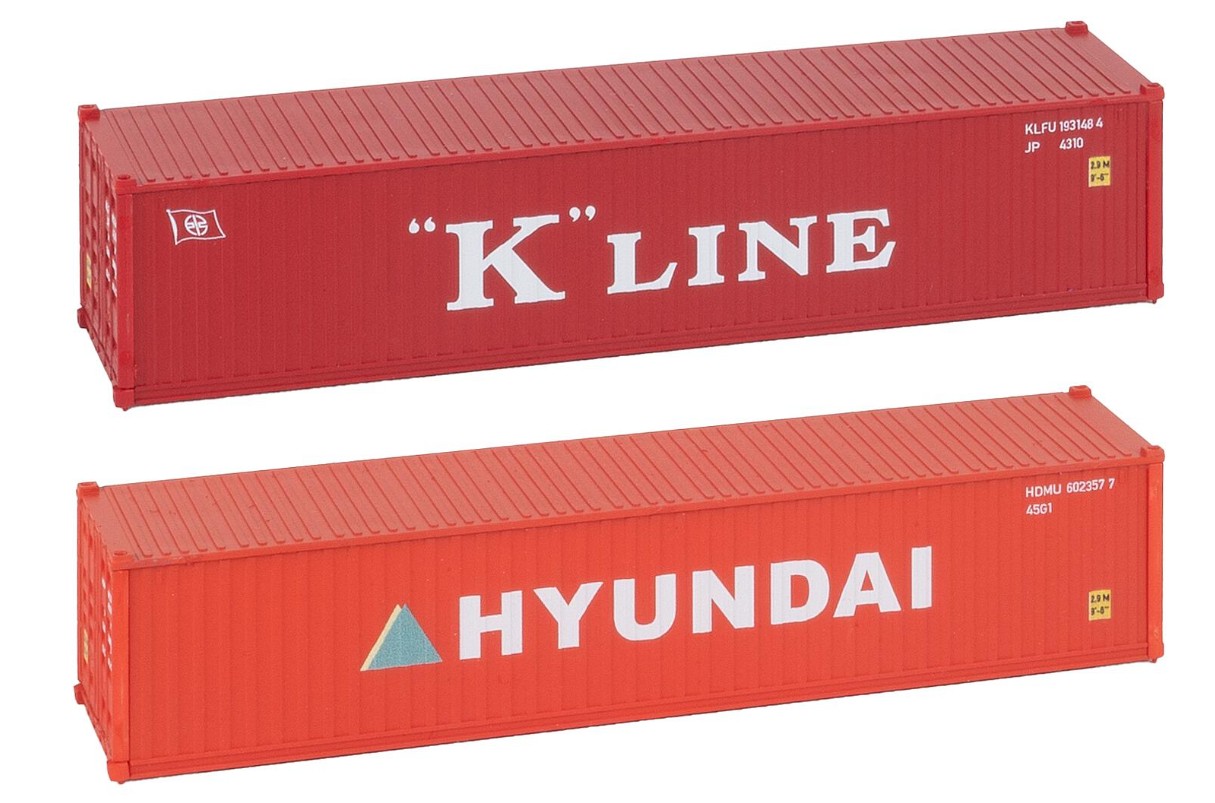 Ein dunkelroter K-Line-Container und ein orangeroter HYUNDAI-Container bringen internationales Frachtflair in die Modellwelt. Ideal, um Industrieanlagen, Hafenszenen oder Güterwaggons authentisch zu gestalten – passend für Märklin-Waggons und perfekt für detailverliebte Szenenbauer.