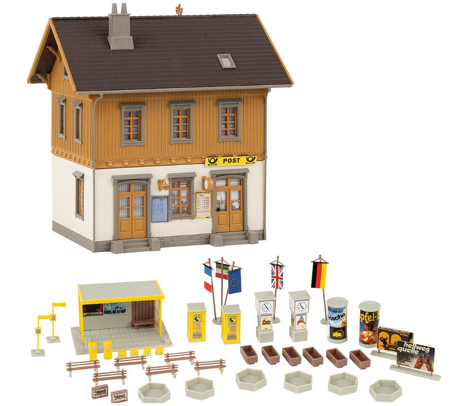 Ländliches Postamt zur Gestaltung einer idyllischen Dorfszene auf der H0-Modelleisenbahnanlage. Das aus der Epoche III stammende Gebäude kommt in einem stilsicher renovierten Erscheinungsbild daher. Passendes Zubehör wie Telefonzellen, Bushaltestellen, Briefkästen, Litfaßsäulen, Parkbänke uvm. liegen dem Bausatz bei.