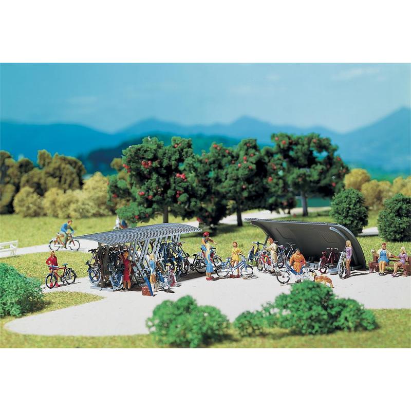 Die beiden Radständer mit den 16 Fahrrädern (8 Damen- und 8 Herrenräder) sind Ausschmückungsdetails, die wohl auf jeder Anlage an vielen Plätzen für noch mehr Realität in der Modellwelt sorgen – gesund und umweltfreundlich.