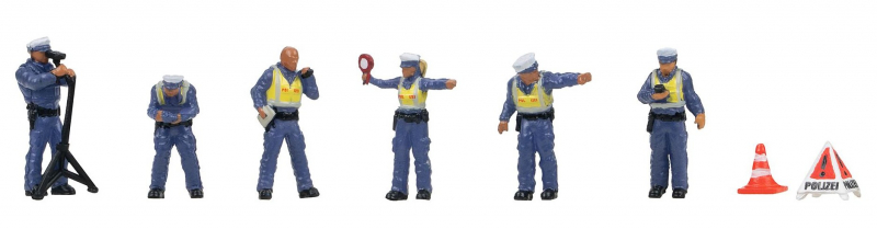 Sicherheit hat Vorfahrt! Fünf Polizisten und eine Polizistin in dunkelblauer Uniform und leuchtend gelber Warnweste sind im Einsatz – aufmerksam und routiniert übernehmen sie die Verkehrskontrolle und sorgen für Sicherheit auf den Straßen der Modellanlage.