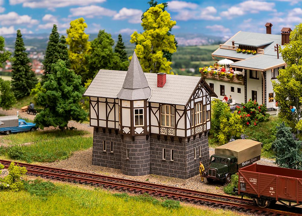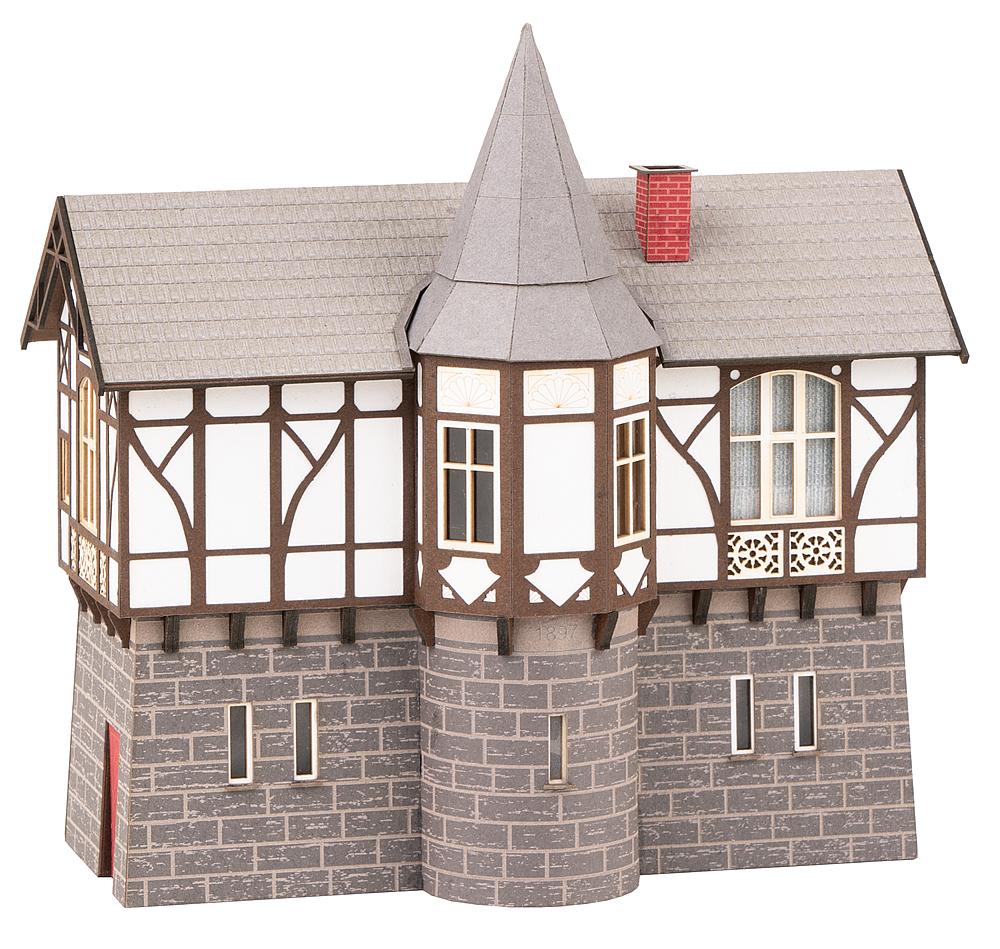 Harzer Heimatstil. Lasercut-Modell nach dem Originalvorbild des 1897 erbauten, heute denkmalgeschützten Stellwerks Thale Ost mit gemauertem Erdgeschoss und einem Fachwerkobergeschoss mit Erkertürmchen.