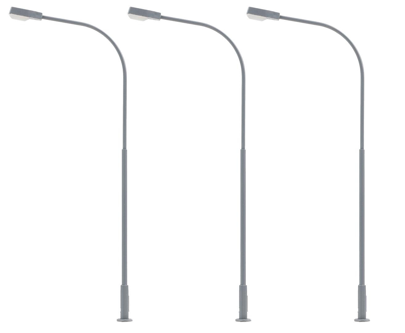 Moderne und weitverbreitete Neonleuchte. Besonders geeignet zur Ausgestaltung von Stadt-, Straßen- und Industrieszenerien. Der Mast ist aus Metall gefertigt und die Leuchtenhöhe variabel einstellbar. Die filigrane einflammige Leuchte ist mit langlebiger LED-Technik ausgestattet. Das Produkt ist anschlussfertig für 12 V Gleichspannung (DC). Nutzen Sie für den Betrieb der Leuchte den »Transformator«, Art. 180641. Höhe: 95 mm. Lichtfarbe: kaltweiß. Inhalt: 3 Stück.