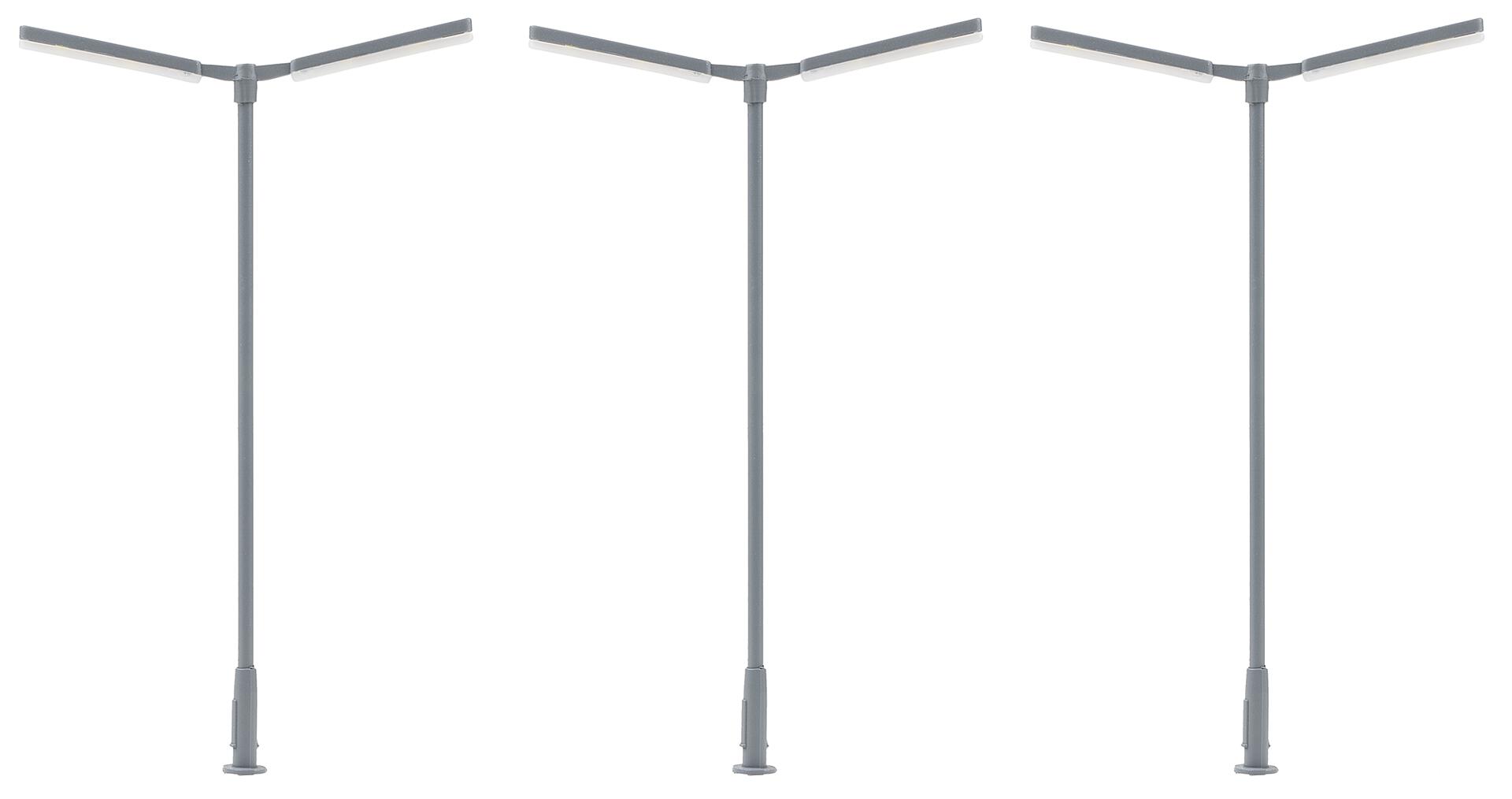 Moderne und weitverbreitete Neonleuchte. Besonders geeignet zur Ausgestaltung von Stadt-, Straßen- und Industrieszenerien. Der Mast ist aus Metall gefertigt und die Leuchtenhöhe variabel einstellbar. Die filigrane einflammige Leuchte ist mit langlebiger LED-Technik ausgestattet. Das Produkt ist anschlussfertig für 12 V Gleichspannung (DC). Nutzen Sie für den Betrieb der Leuchte den »Transformator«, Art. 180641. Höhe: 95 mm. Lichtfarbe: kaltweiß. Inhalt: 3 Stück.