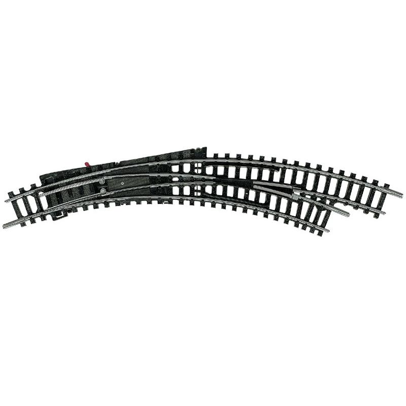 Bogenweichen R1/R2.Die Bogenweiche R1/R2 ist speziell an die Bogengleise dieser beiden Radien angepasst, d. h. der innere Bogen der Weiche entspricht dem Radius 1, der äußere dem Radius 2. Es handelt sich jedoch in beiden Fällen um einen Bogen spezieller Formgebung, um diese Weichen möglichst vielseitig einsetzen zu können. Bogenweichen für die Radien 1 und 2.Weichenbogen entspricht 42°. Stopp-Weichen-Funktion wahlweise. Elektroantrieb ist nachrüstbar.