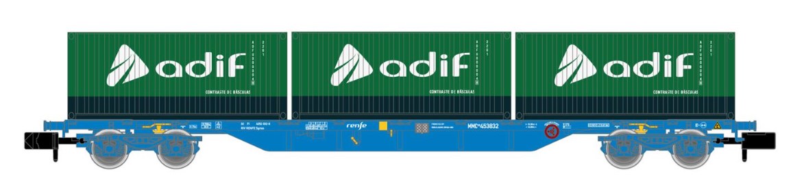 4-achs. Containerwagen in blauer Lackierung beladen mit 3 x 20' Container „Adif"