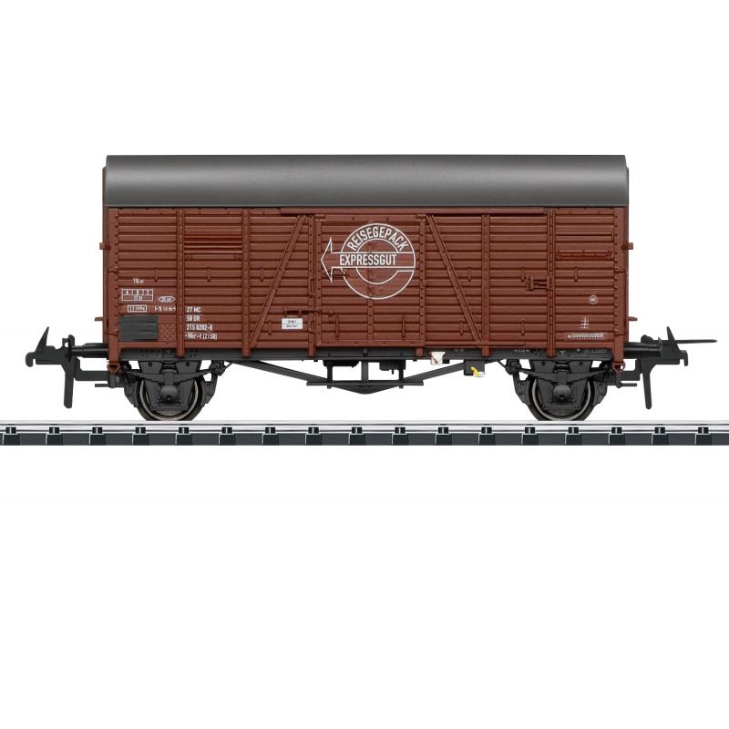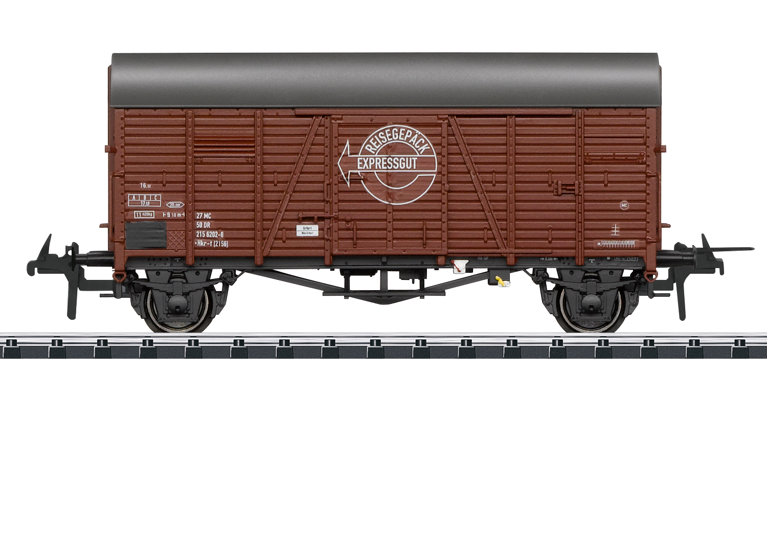 Zweiachsiger gedeckter Güterwagen Bauart Hkr-t (ex Ghs Oppeln) als Reisegepäck- und Expressgutwagen der deutschen Reichsbahn (DR/DDR). Rotbraune Grundfarbgebung. Betriebszustand ab 1977.