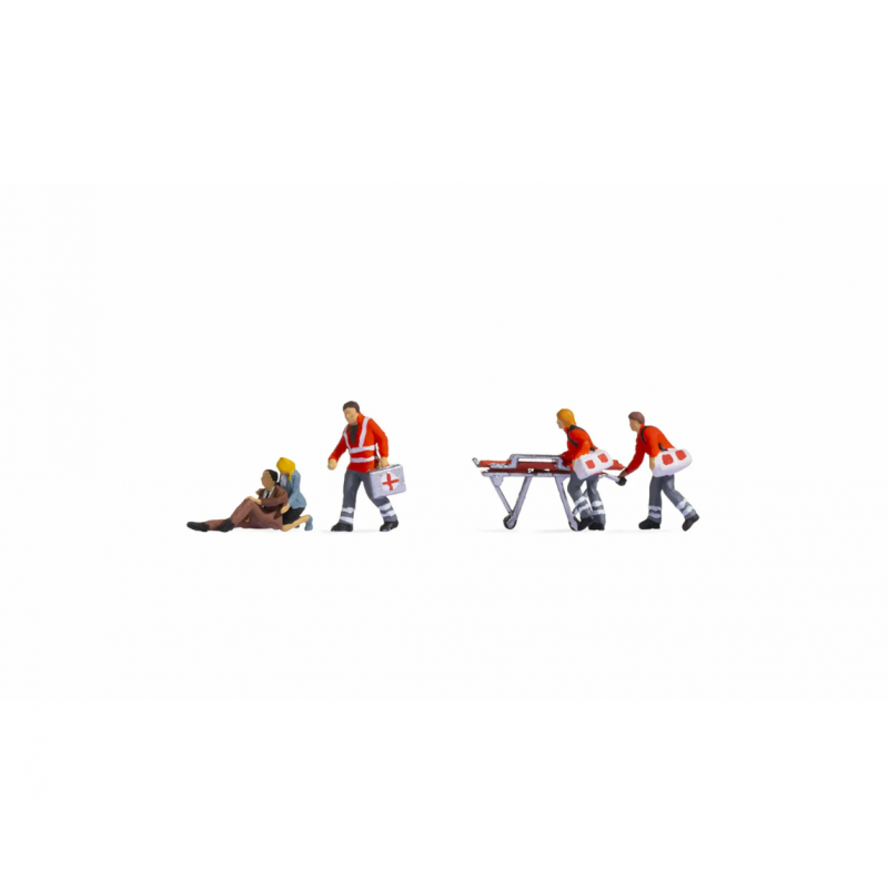 In dem Figuren-Set für die Spurweite N sind sechs Figuren sowie eine Rettungstrage enthalten. Die zwei Sanitäter mit Arzttaschen schieben die Rettungstrage zum Patienten. Der Notarzt mit Koffer macht sich ebenfalls auf den Weg zum Verletzten. Dieser sitzt mit einem angewinkelten Bein auf dem Boden, während sich die Passantin hinter ihm um sein Wohl sorgt.
