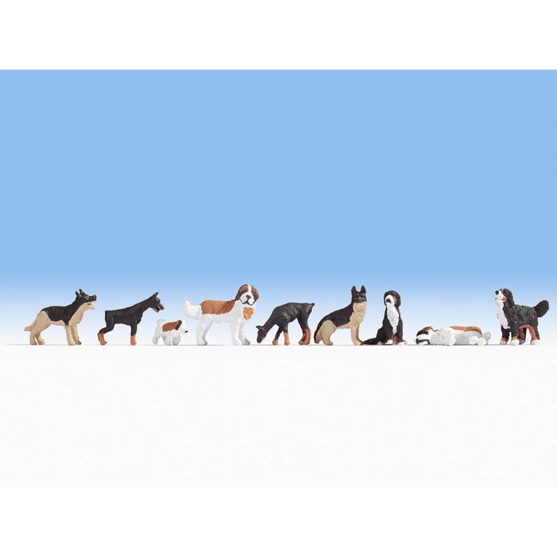 Fünf der Hunde haben die Farben Braun, Weiß und Schwarz wohingegen zwei Hunde braun-schwarz und weitere zwei Hunde beige-schwarz sind. Die Modellfiguren sind ideal zur Ausgestaltung von ländlichen Szenen geeignet.